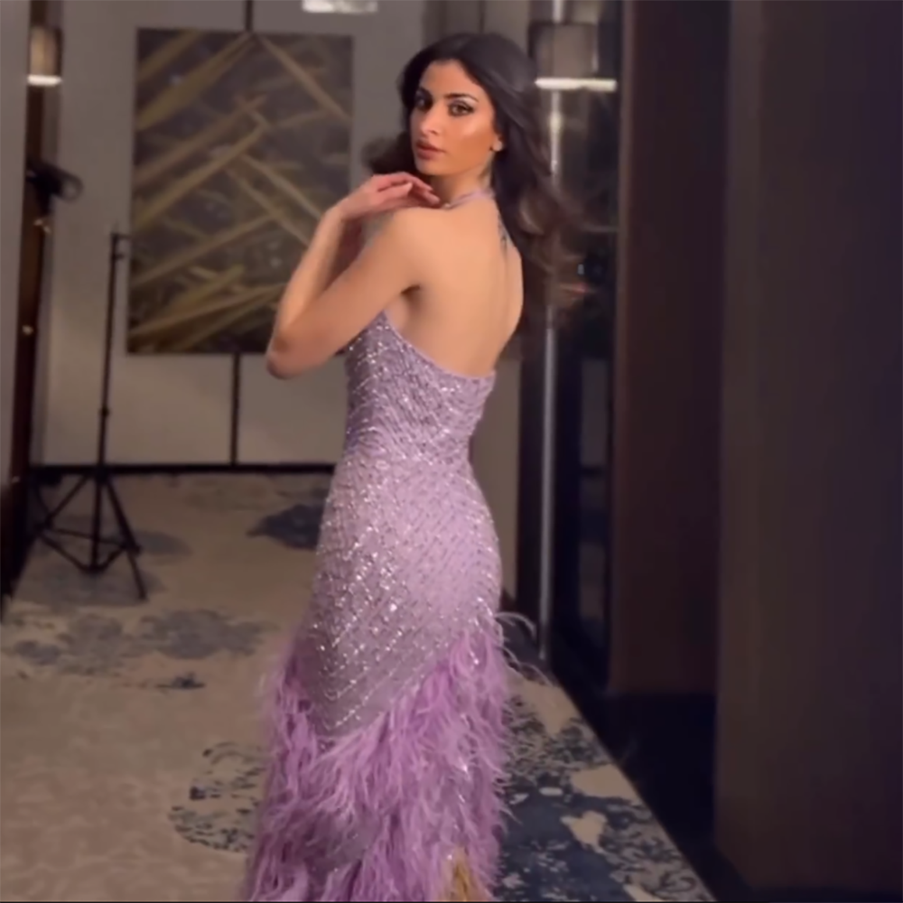 Add a touch of luxury to your evening events with our SERENE HILL Lilac Evening Dress. The elegant halter design and mermaid silhouette are complemented by delicate feathers. making it perfect for weddings. proms. and other special occasions. Channel your inner mermaid and make a statement in this one-of-a-kind gown.