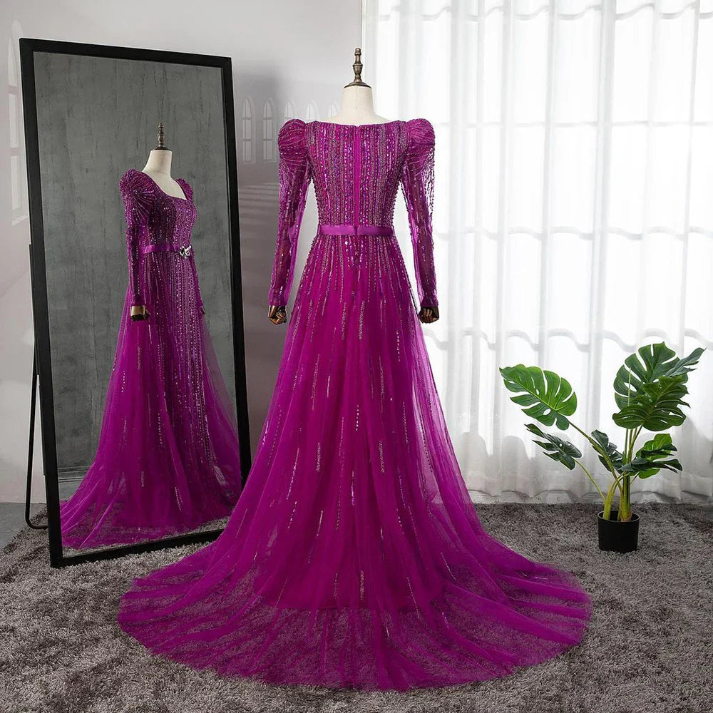 On Sale no return no refund Luxury Dubai Fuchsia Evening Dresses for Women Wedding 2025 Long Sleeve Overskirt Arabic Formal Party LA71678