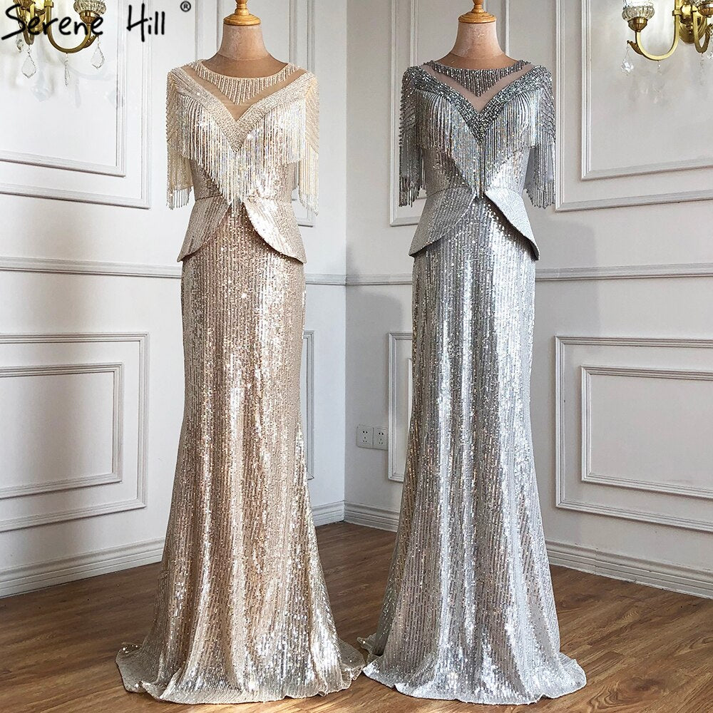 Sale Luxury Silver Mermaid Evening Dresses Gowns 2025 Elegant Half Sleeves Beading Tassel For Women Party LA71017