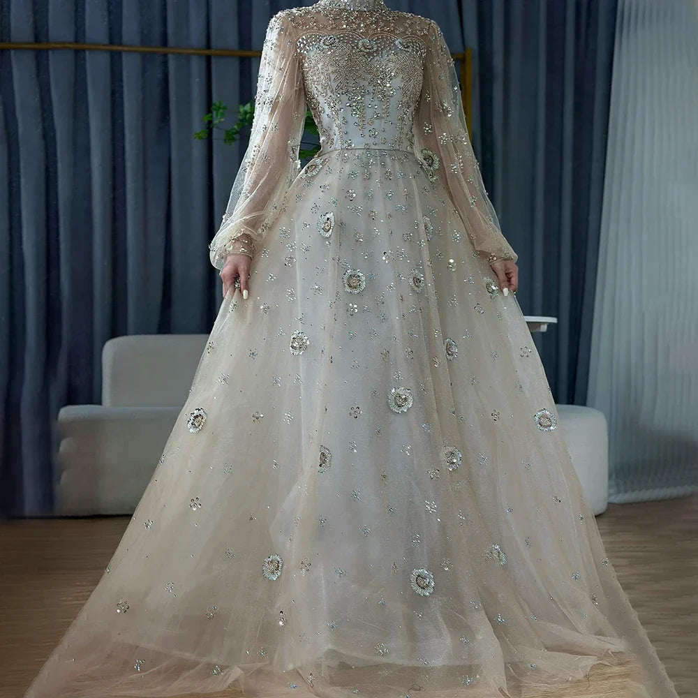Muslim Nude A-Line Beaded Luxury Elegant Dubai Evening Gown Wedding Party LA72594