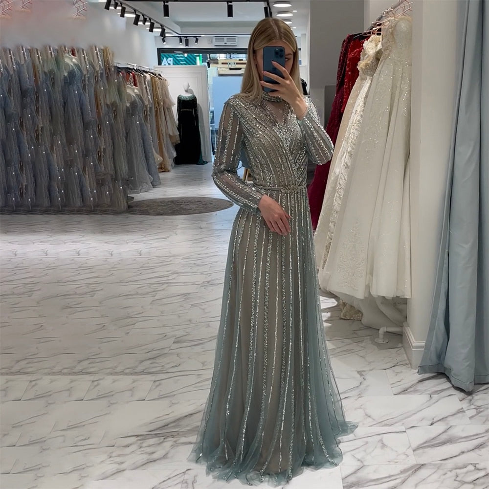 Muslim Turquoise A Line Beaded Luxury Dubai Long Evening Dresses Gowns For Women Wedding Party 2025 LA71812