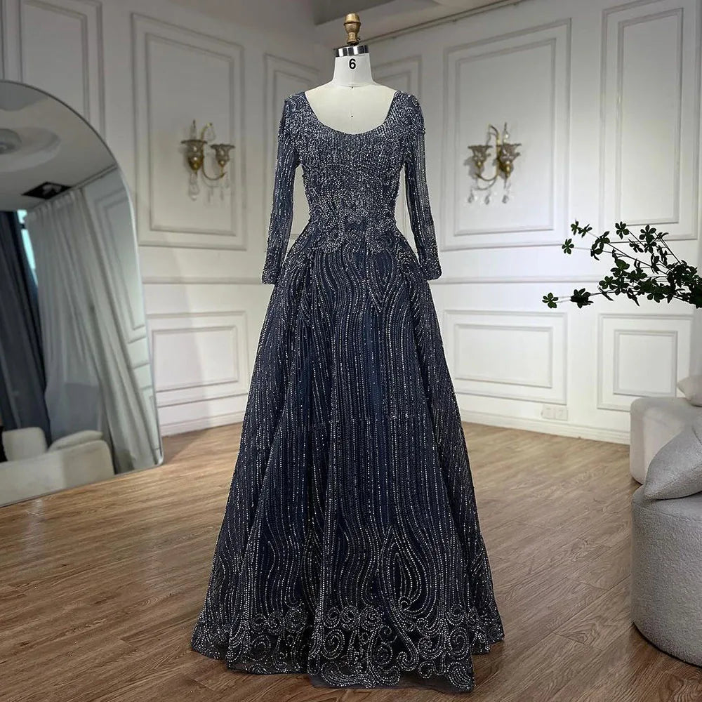 Muslim Navy Blue Overskirt Luxury Dubai Evening Dresses 2025 Elegant A Line Beaded For Women Party LA70773A