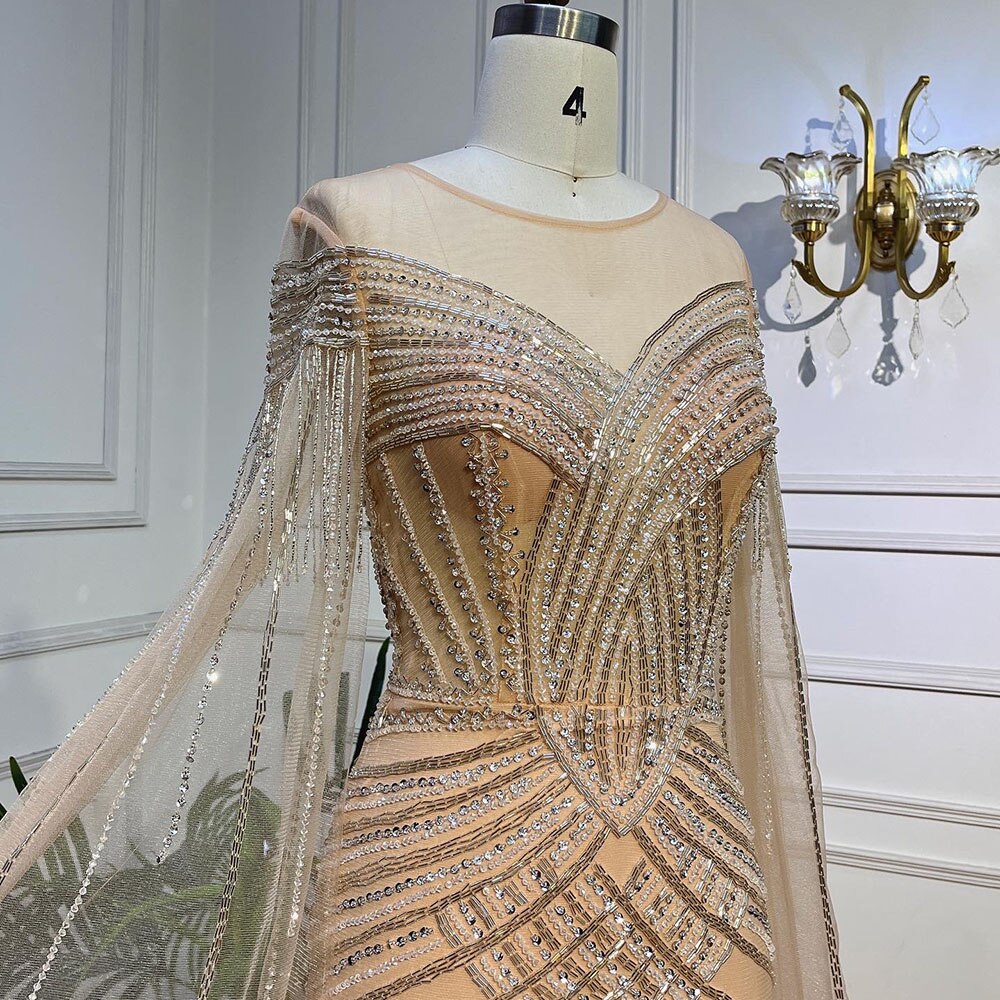 Nude Arabic Mermaid Cape Sleeves O-neck Beaded Evening Dresses Luxury Gowns 2025 For Women Wedding Party LA72012