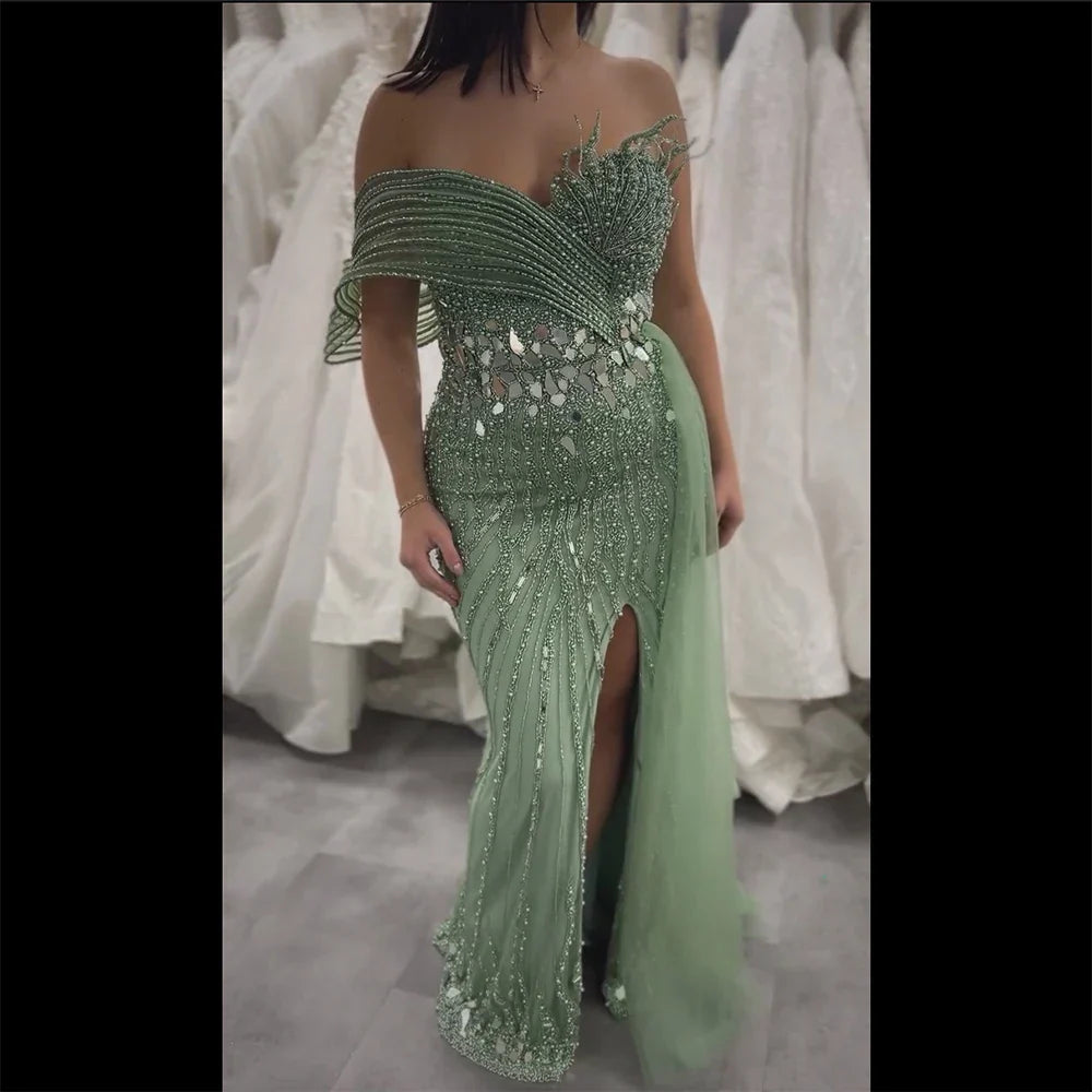 Pink Beaded One-Shoulder Mermaid Evening Gown with Slit and Tulle Detail for Formal Occasion LA72888 2025