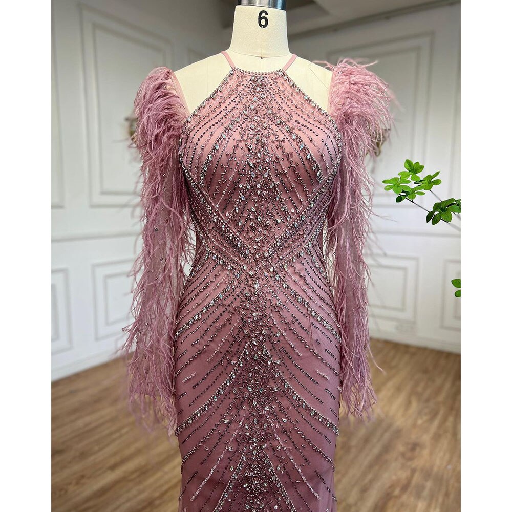 Pink Feathers Mermaid Elegant Long Evening Dresses 2025 Luxury Dubai Gowns for Women Wedding Party LA72116