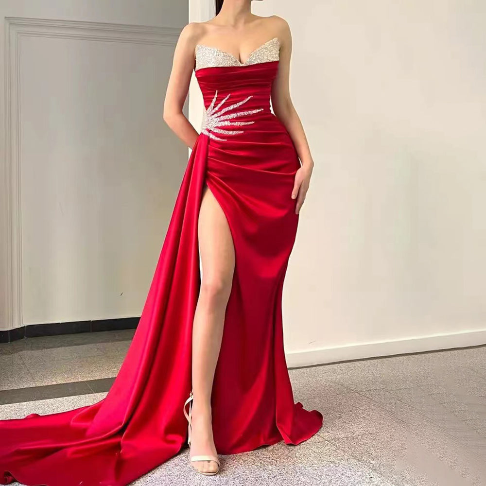 Pink High Split Overskirt Evening Dresses Gowns 2025 Satin Beaded Elegant Mermaid For Women Party LA71615