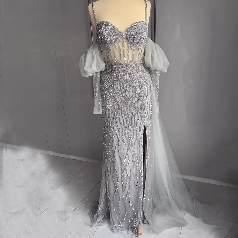 Sexy Gray Beaded Party High Split Spaghetti Straps Mermaid Balloon Sleeves Evening Dresses Gowns 2025 LA71571A