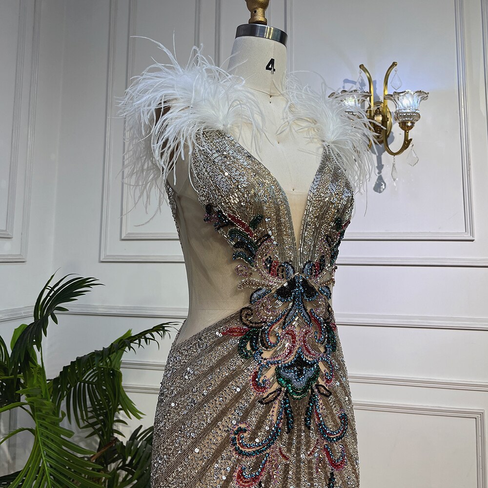Silver Sexy High Split Deep Mermaid Luxury Feather Beads Evening Dresses Gowns For Women Wedding Party 2025 LA72011