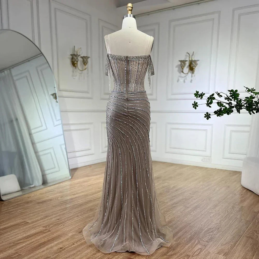 Sliver nude Boat Neck Split Mermaid Elegant Beaded Tassel Evening Dresses Gowns For Woman Wedding Party 2025 LA72391