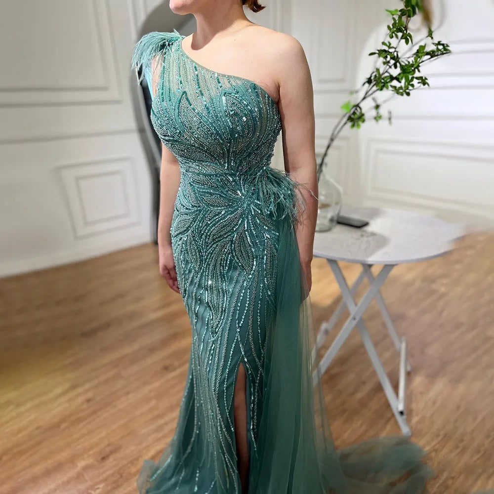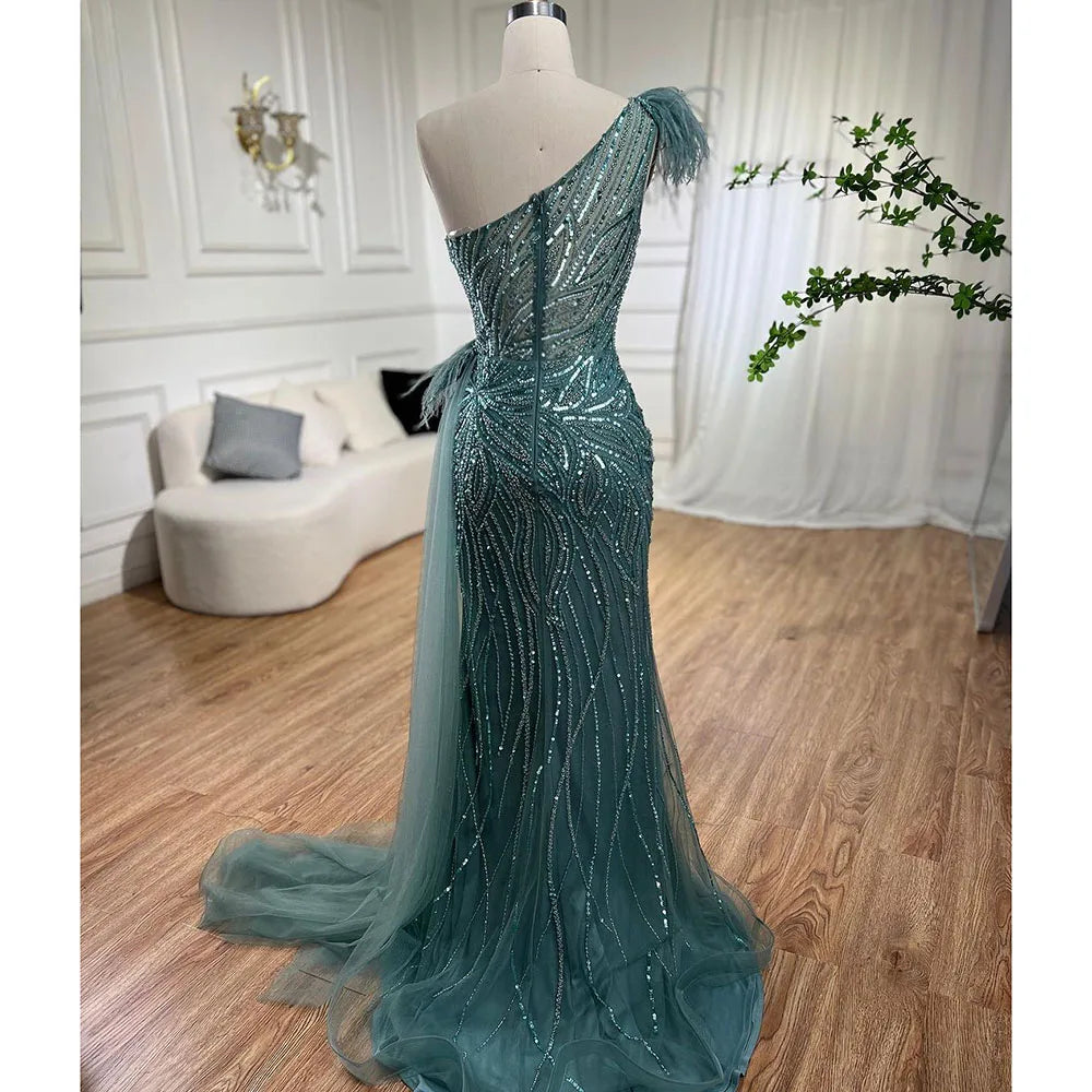 Turquoise Mermaid Sexy High Split With Skirt Beaded Feathers Evening Dresses Gowns 2025 For Women Party LA71955