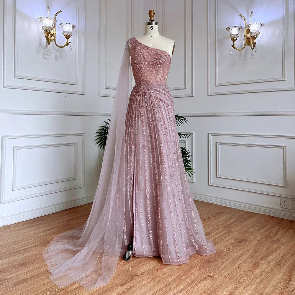 Yellow One-Shoulder Cape Sleeve 2025 Luxury Beaded Formal Occasion Evening Dresses Gowns For Women Party LA71671