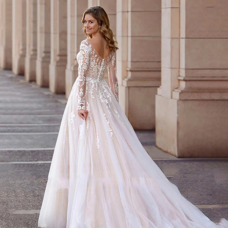 Sexy Lace Simple Elegant Mopping Wedding Dresses V-neck Long Sleeves Plain White Pretty Fascinating Bridal Gowns Backless 2023