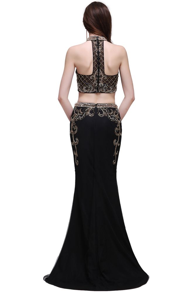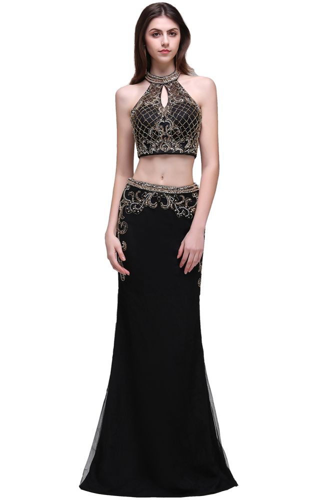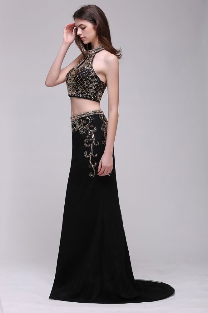 Sheath Crystal Halter Black Two Pieces Prom Dresses