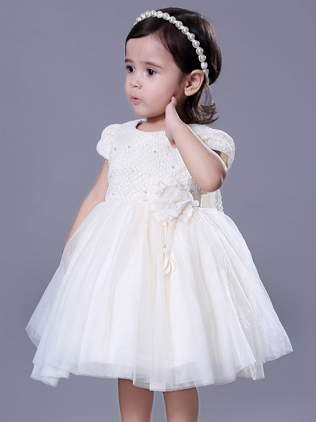 Short Ball Gown Lace Jewel Neck Wedding Event Party Flower Girl Dresses with Sleeves