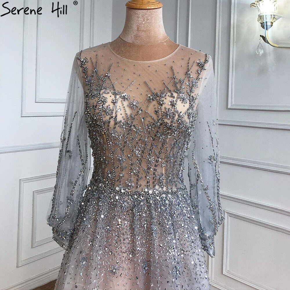 Silver Luxury Long Sleeves Dubai Evening Dresses 2025 A-Line Sequins Beading Sexy Formal Dress LA70418