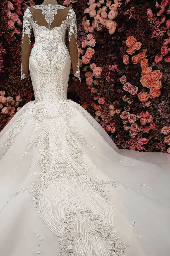 Gorgeous Crystals Mermaid Bridal Wears Long Sleeves Chapel Train Wedding Dress