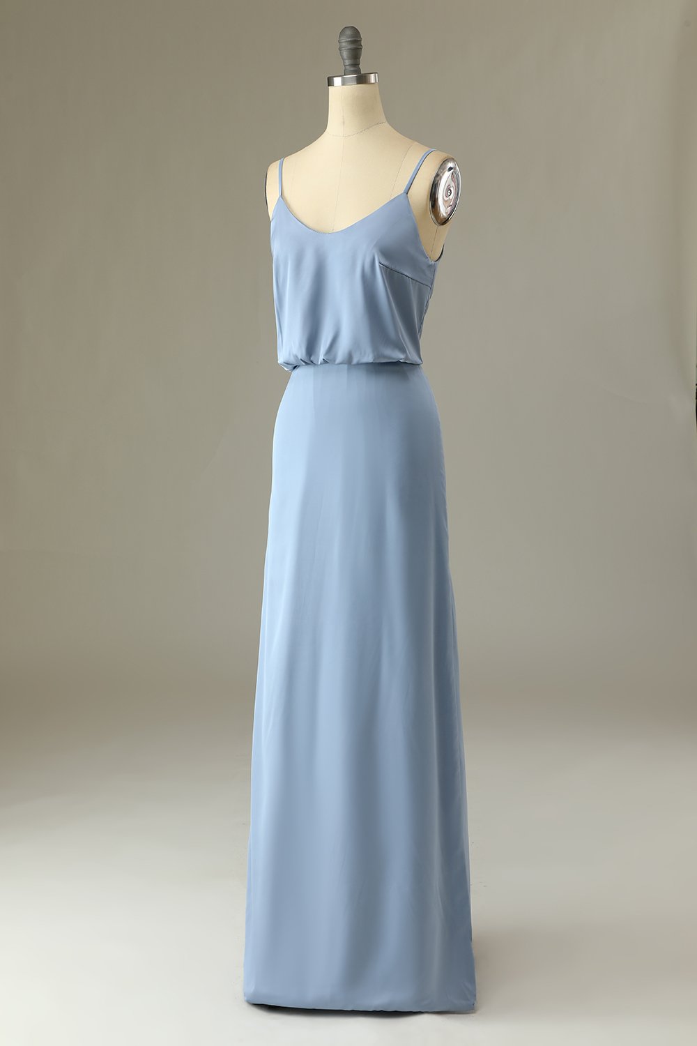 Spaghetti Straps Grey Blue Long Bridesmaid Dress