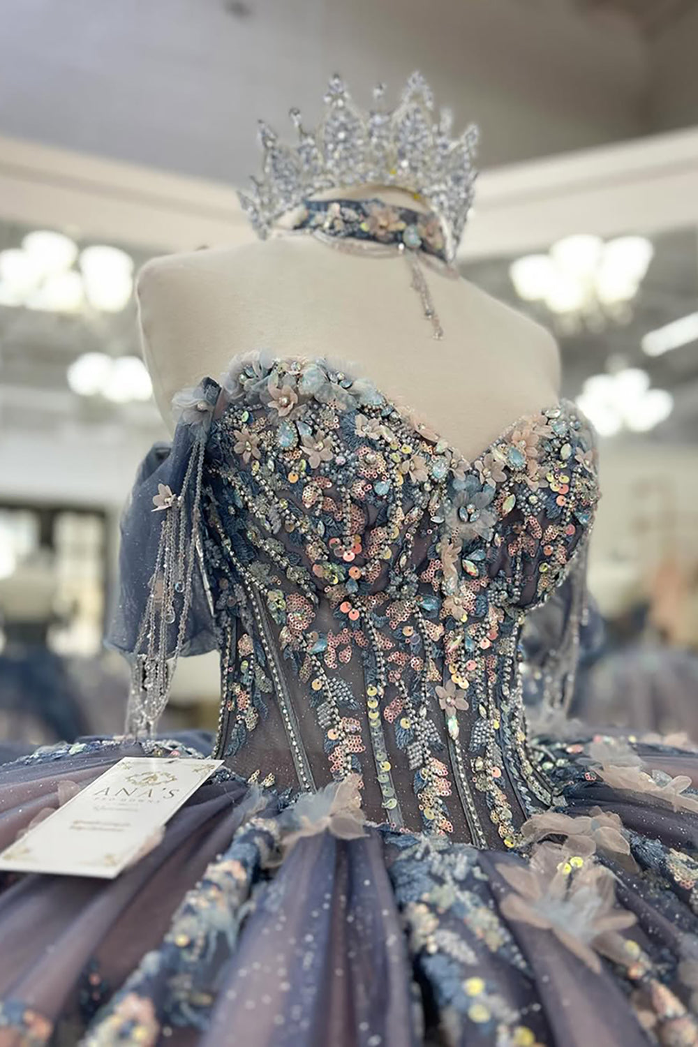 Occasion: Sparkly Grey Blue Off the Shoulder Quinceanera Dresseses. Sweet 16 Dresses. Perfect for Prom Birthday Gowns. Quinceanera Dresses Ball Gowns. Formal Evening Prom. Wedding. Cocktail Party Pageant. Holiday. Reception. Dancing Party. Graduation. Celebrity and other special occasions.