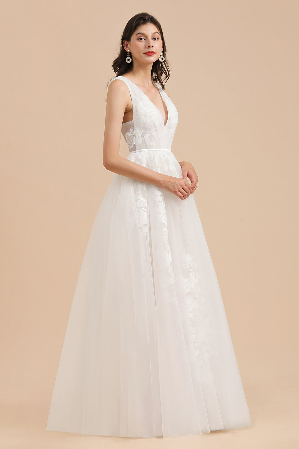 V-Neck Tulle Lace Appliques Simple Wedding Dress Garden Wedding Gowns Floor Length