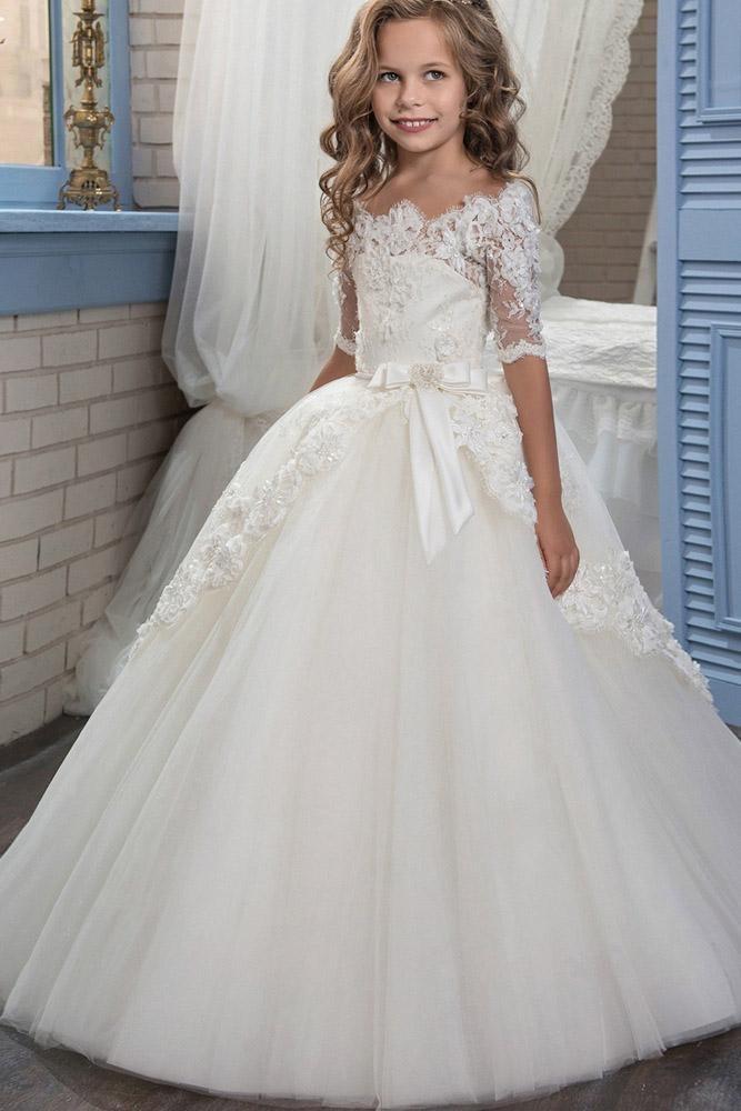 White Off The Shoulder 1/2 Sleeves Ball Gown Flower Girls Dress