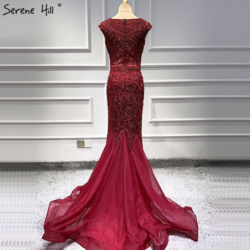 Wine Red Dubai Crystal O-Neck Evening Dresses Mermaid Sleeveless Luxury Formal Dress Real Photo LA60980