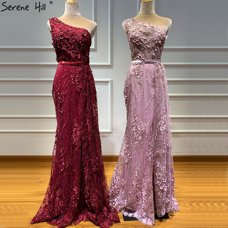 Wine Red Handmade Flowers Pearls Evening Dresses One-Shoulder Sexy Luxury Evening Gowns 2025 LA60901