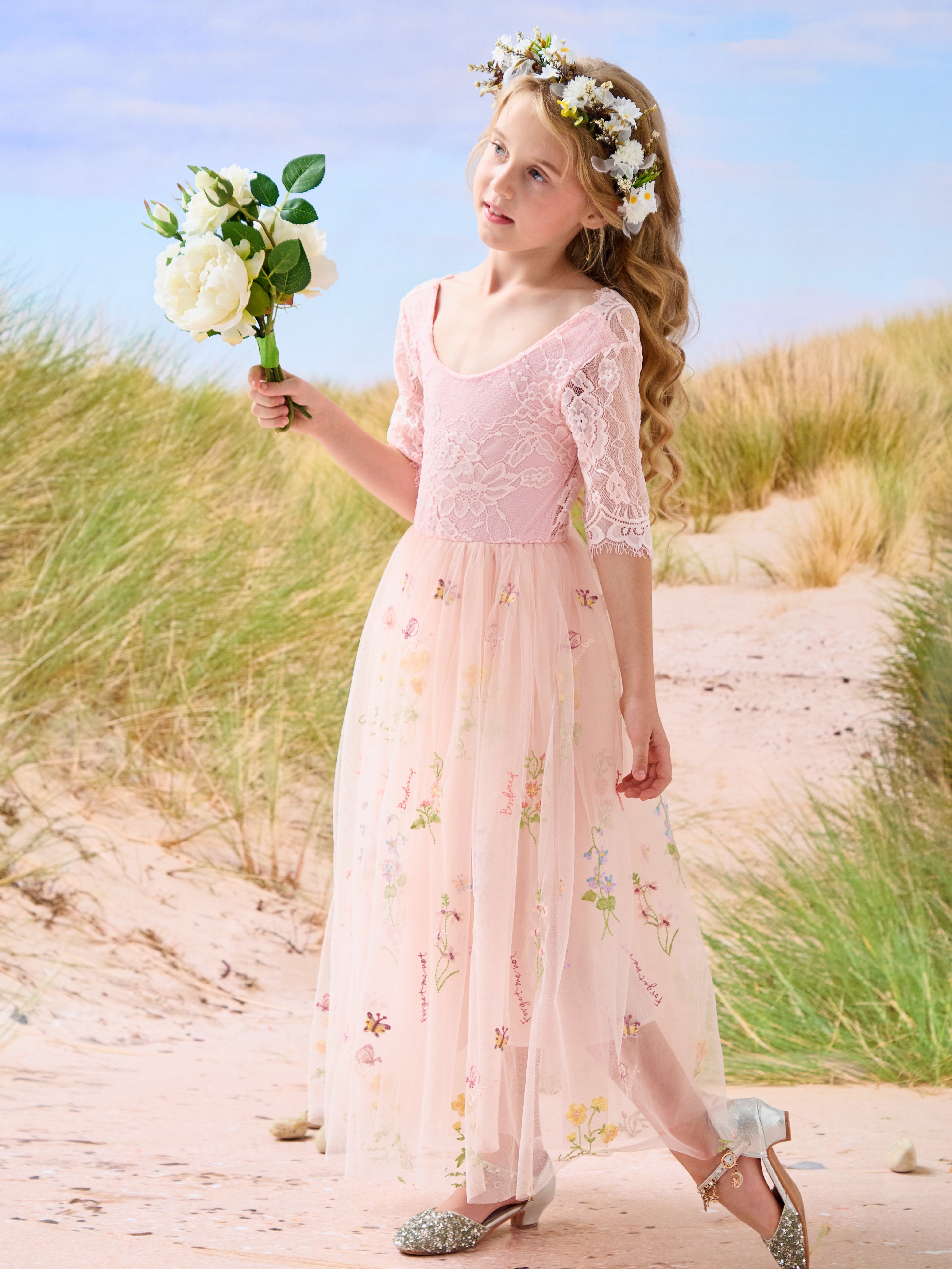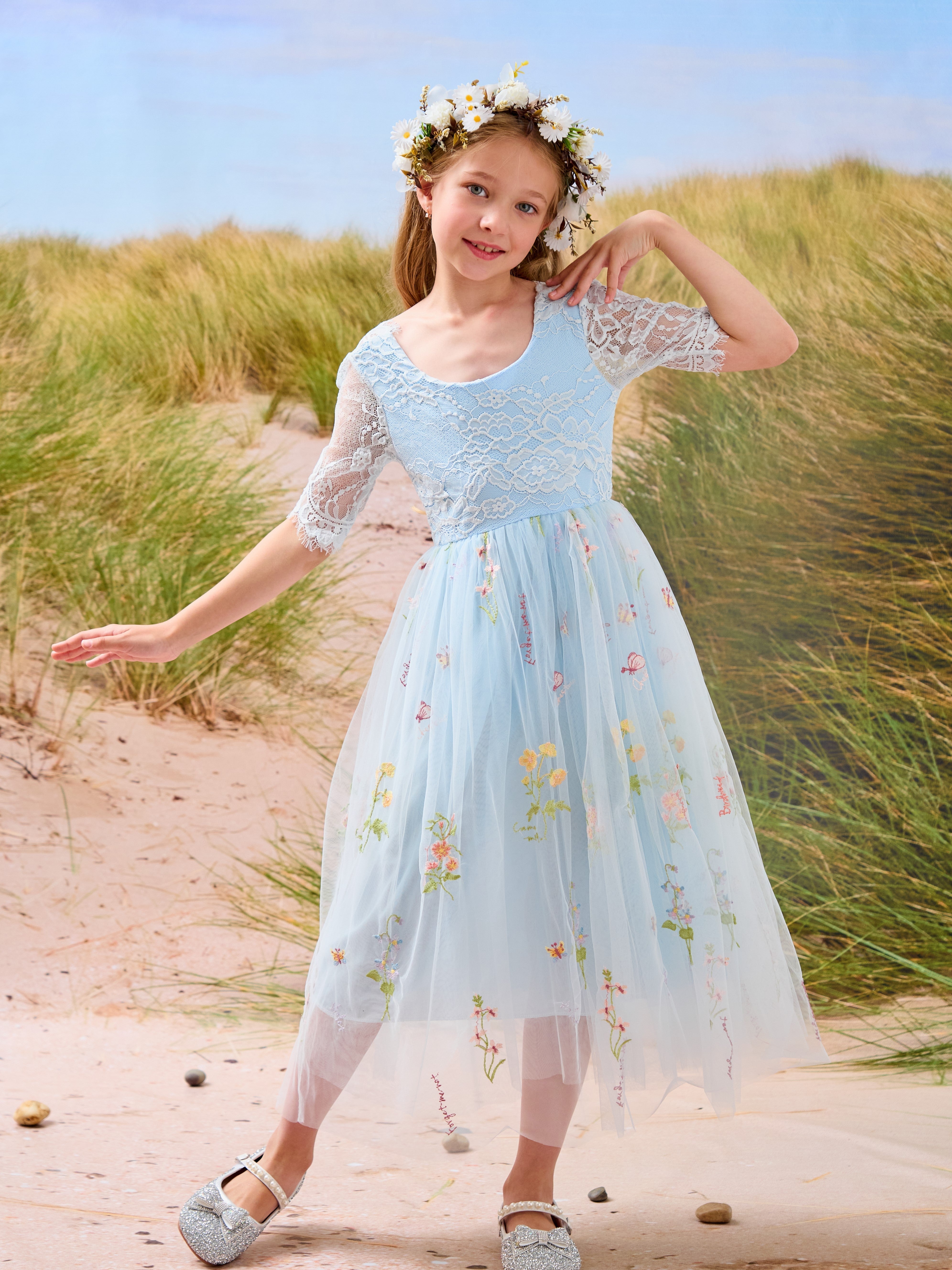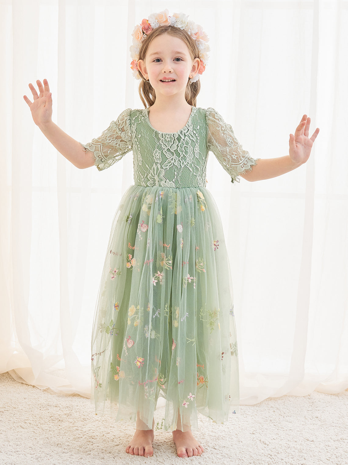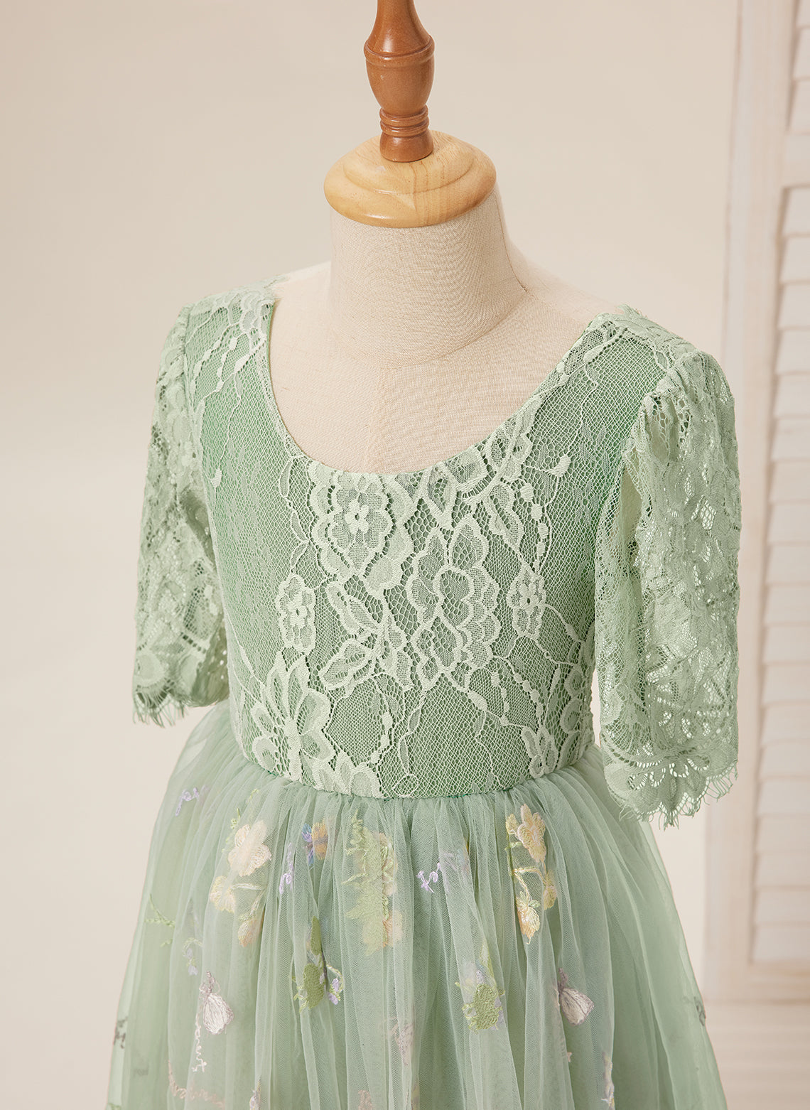 Vestido de niña de las flores color salvia con escote redondo, superficie de tela y tul (2003227581)