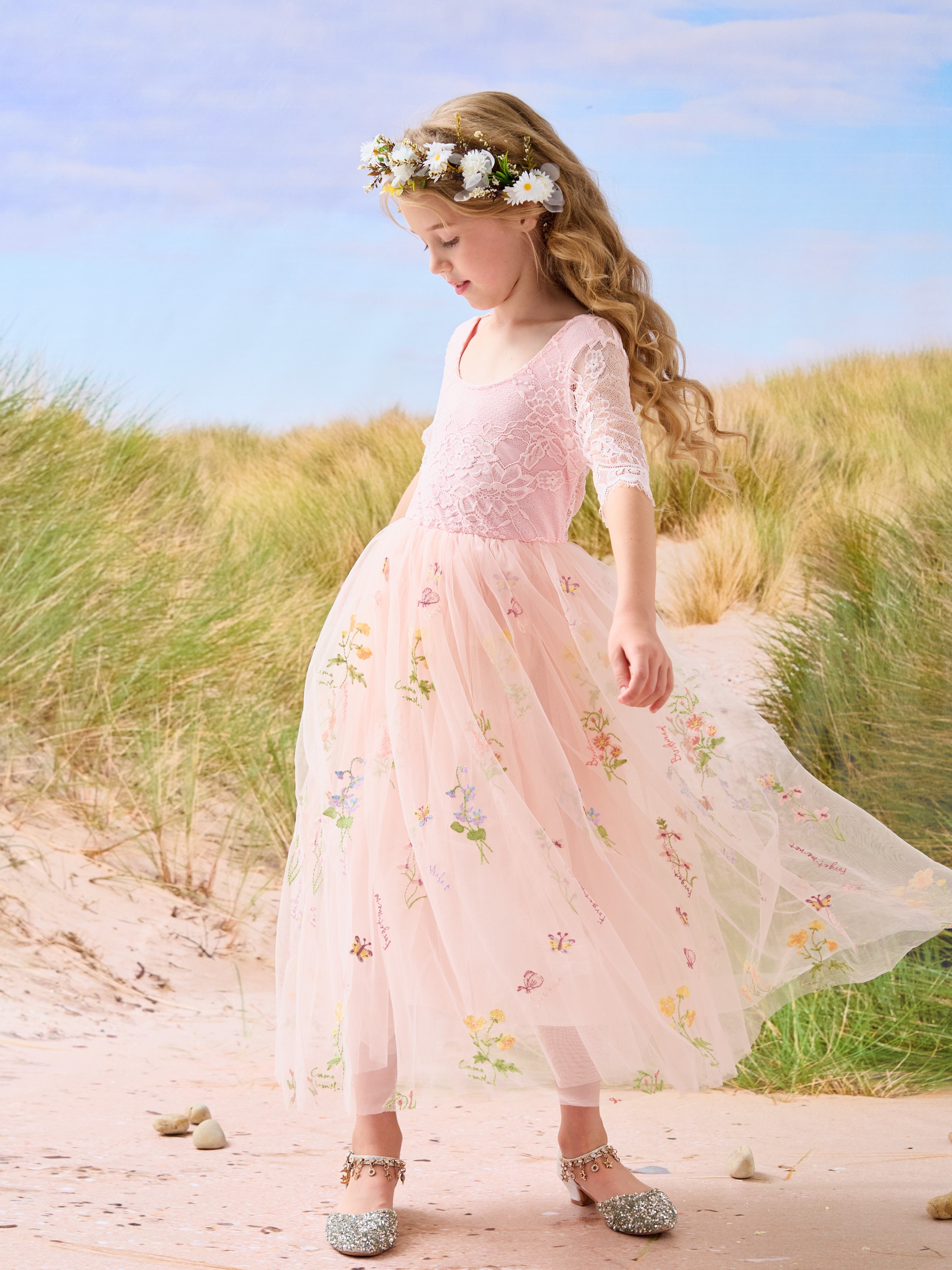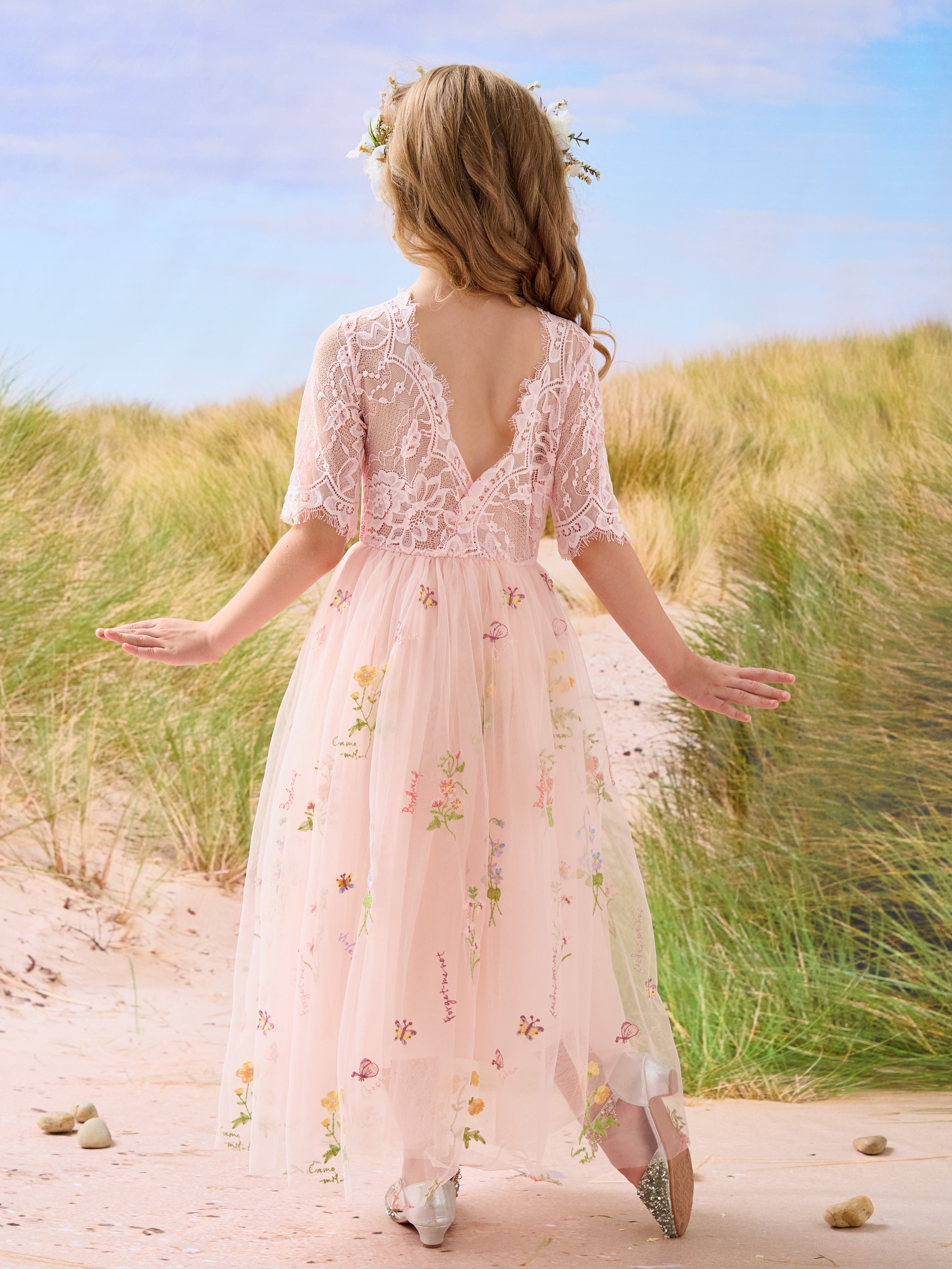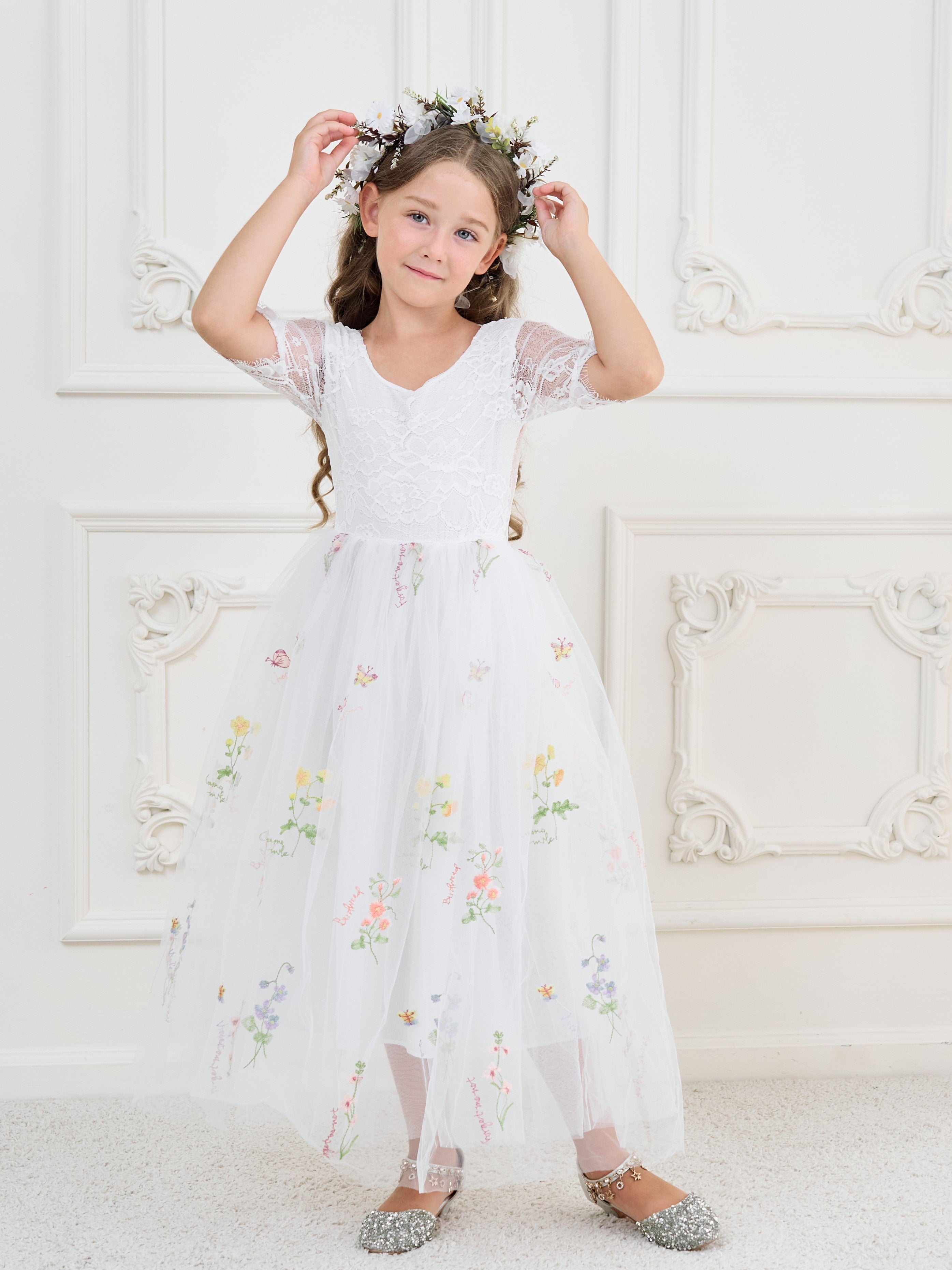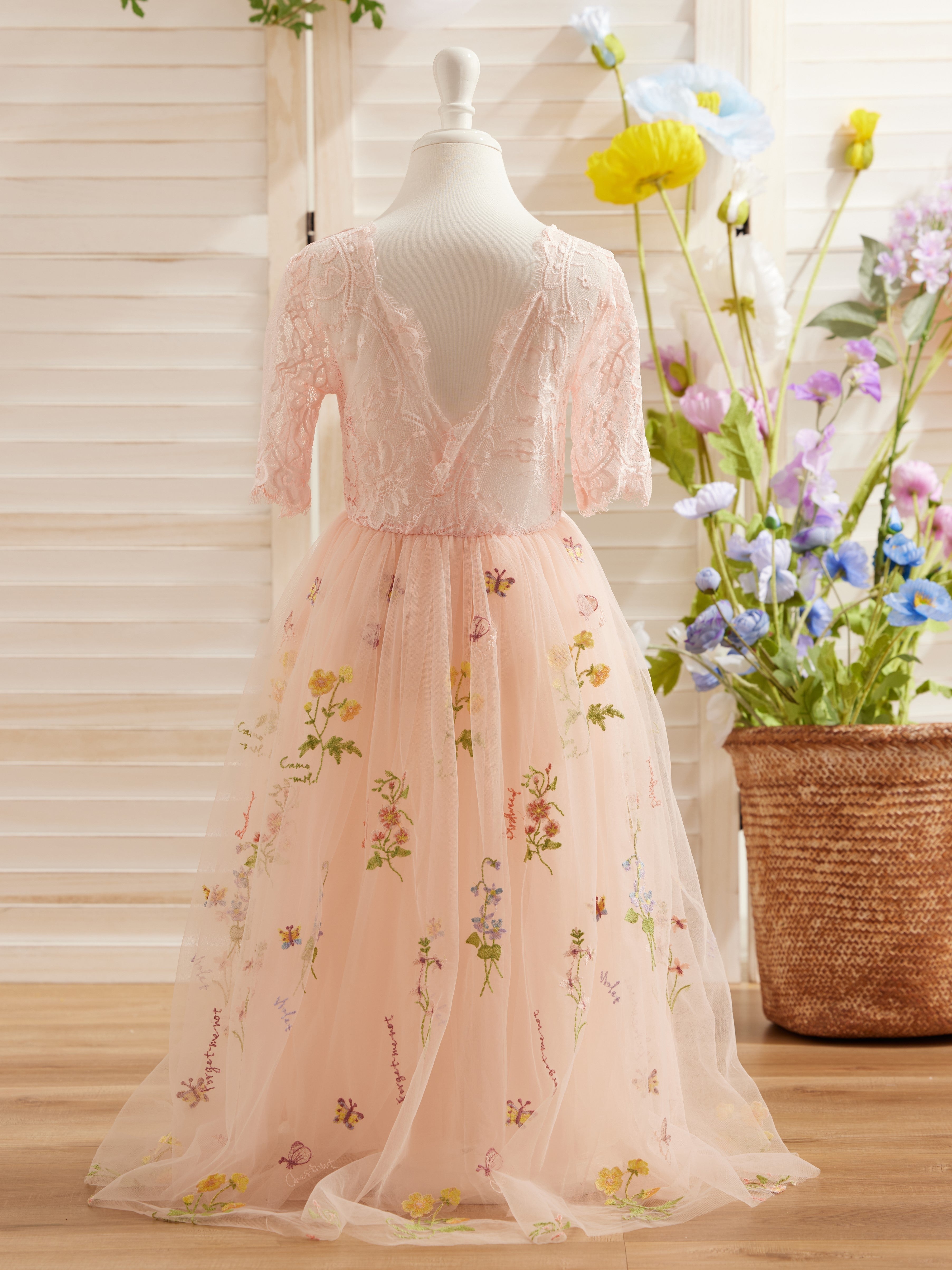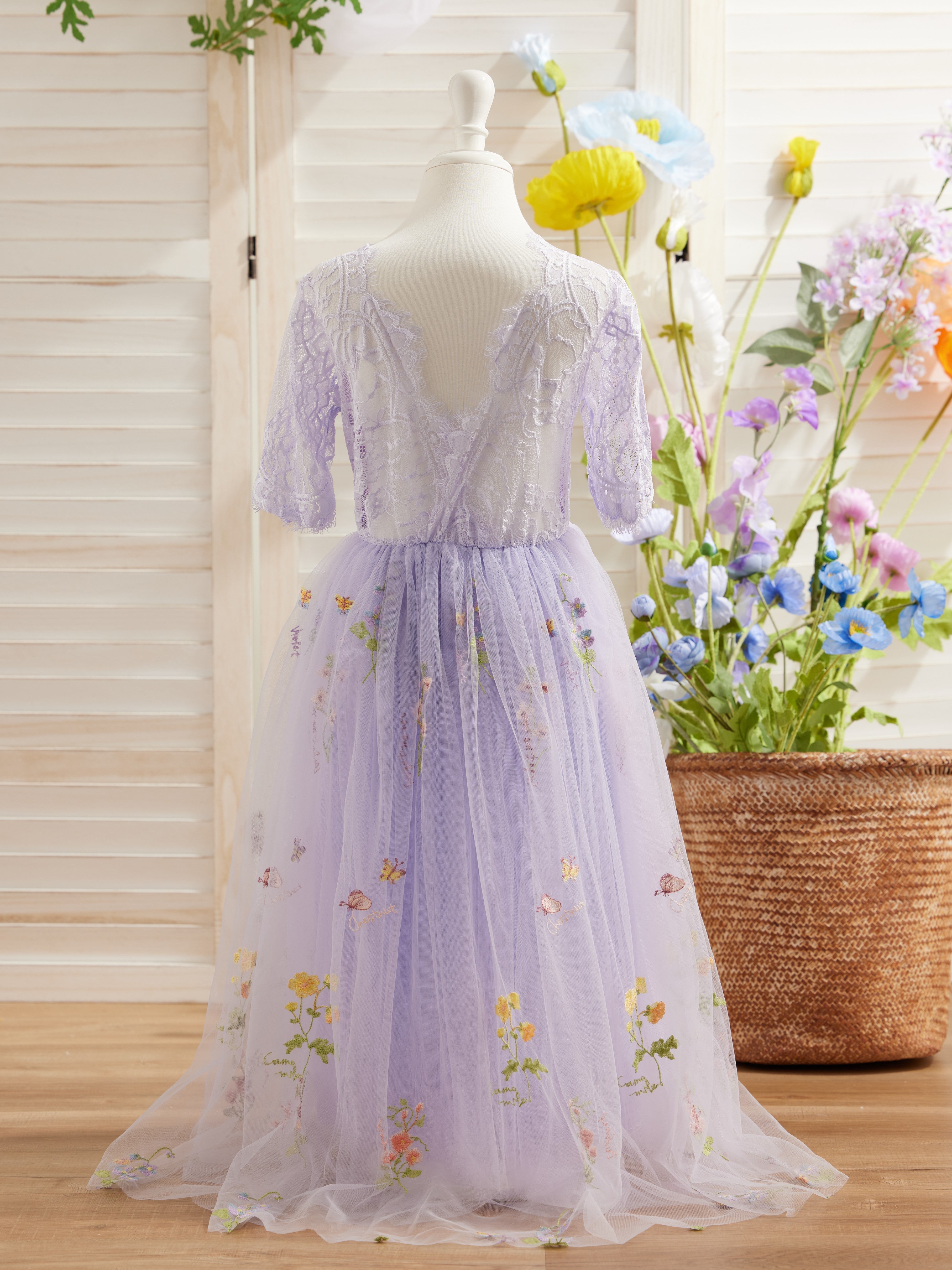Vestido de niña de las flores color salvia con escote redondo, superficie de tela y tul (2003227581)