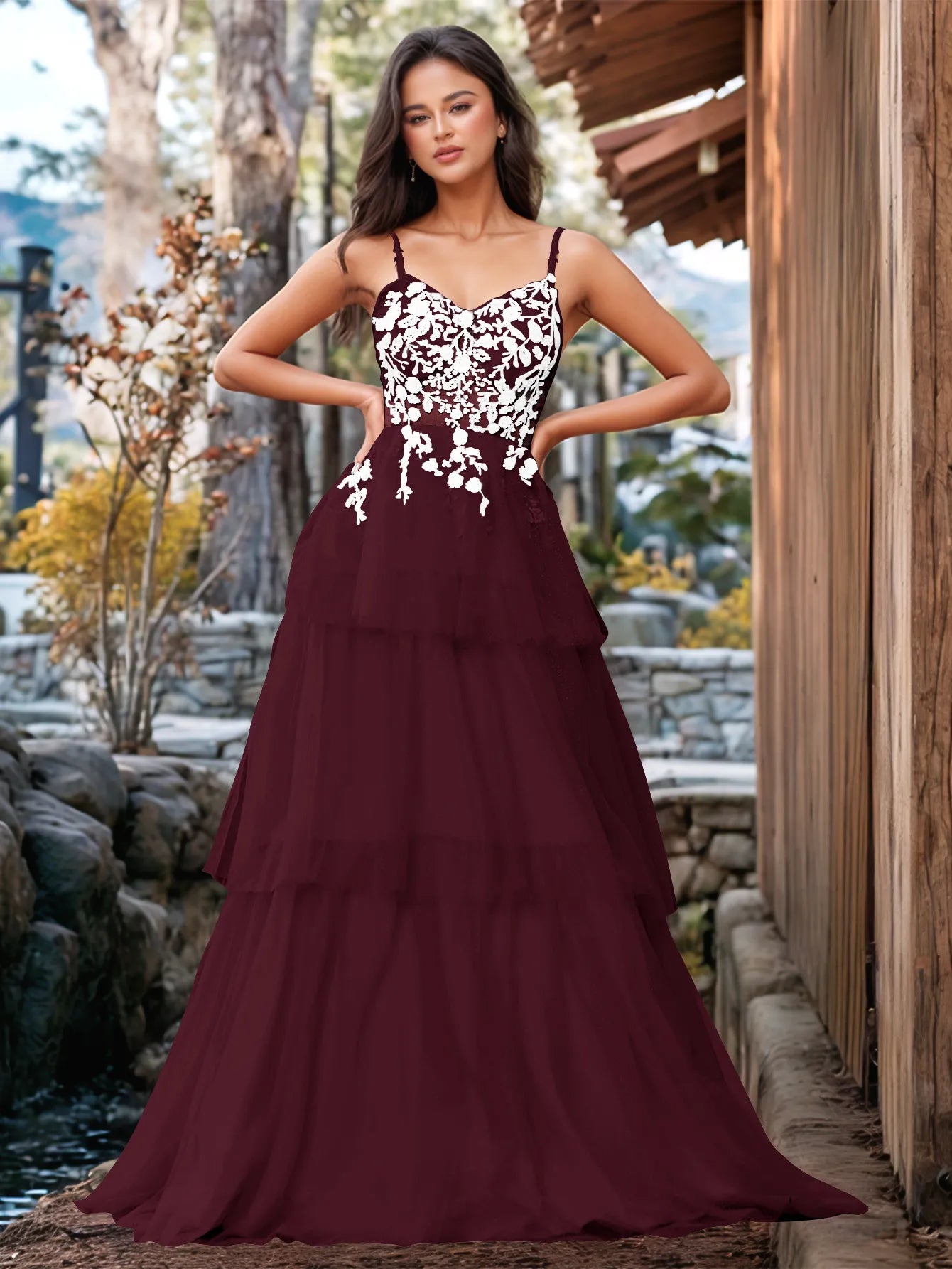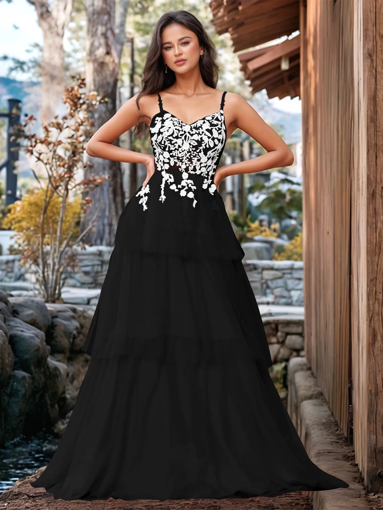 Vestido de fiesta con volantes y vendaje ilusión con bordado floral 3D