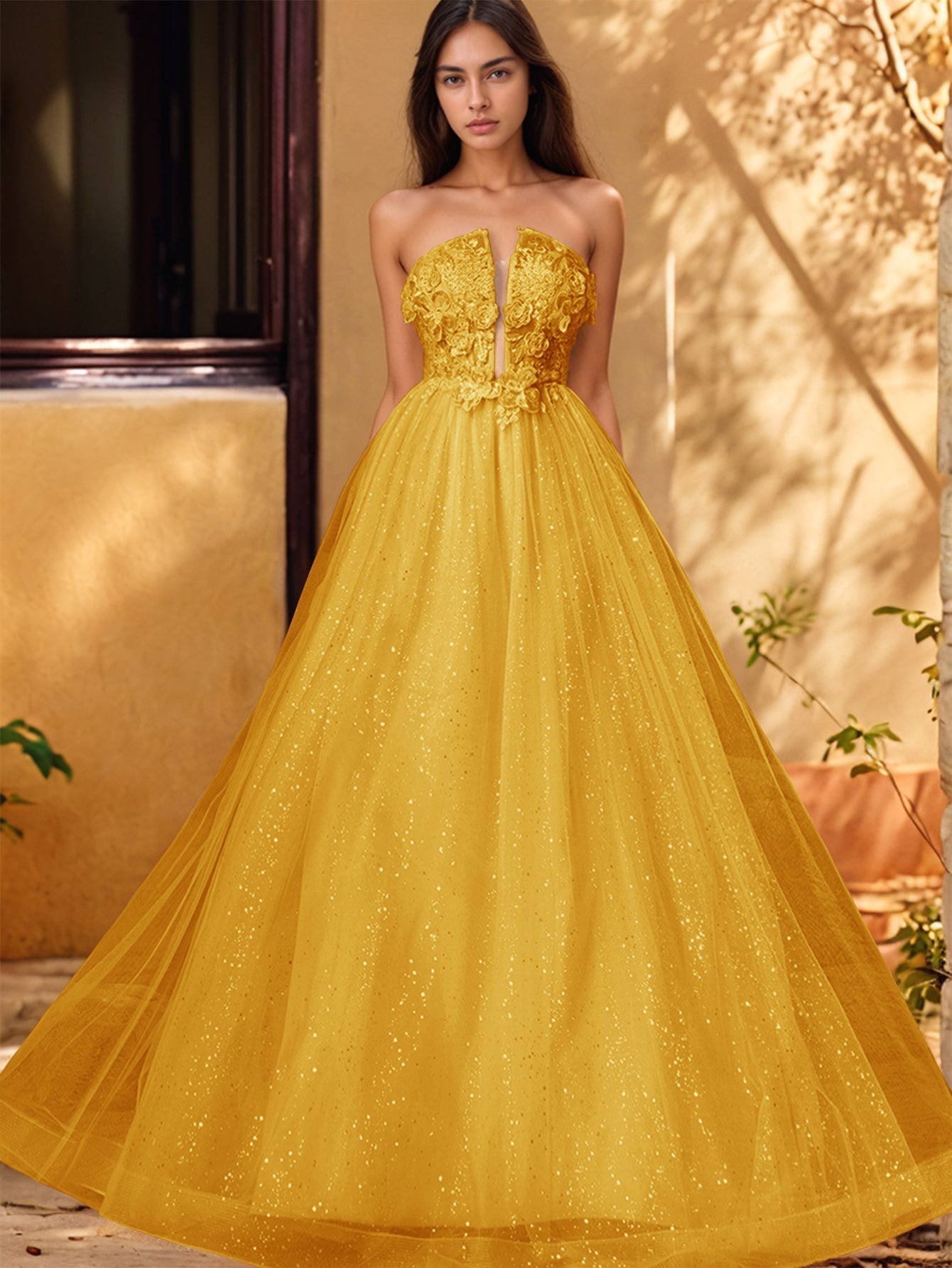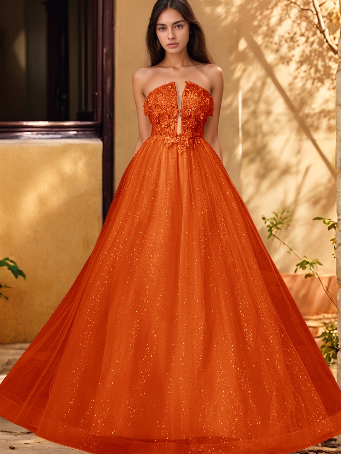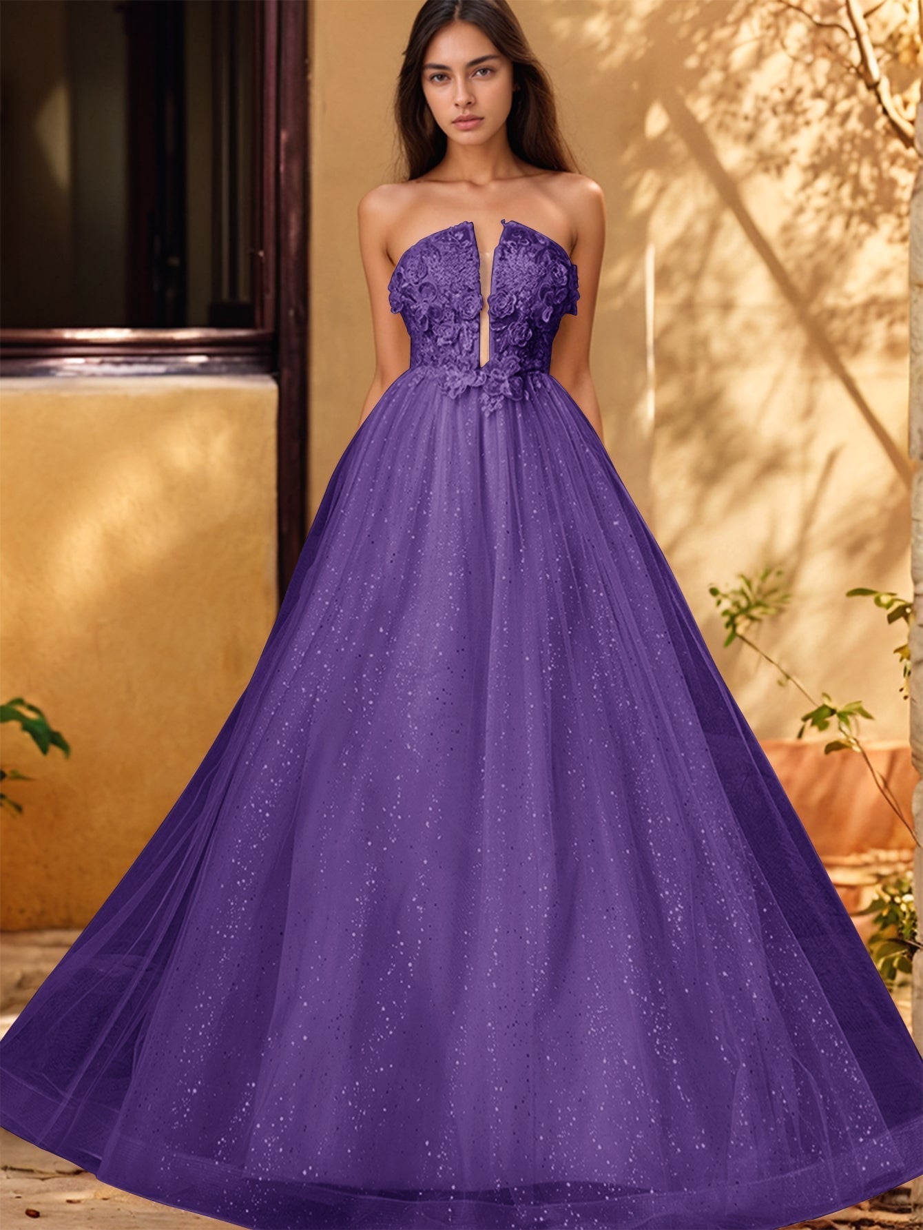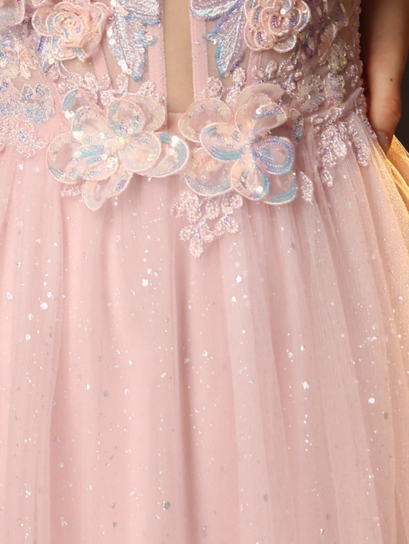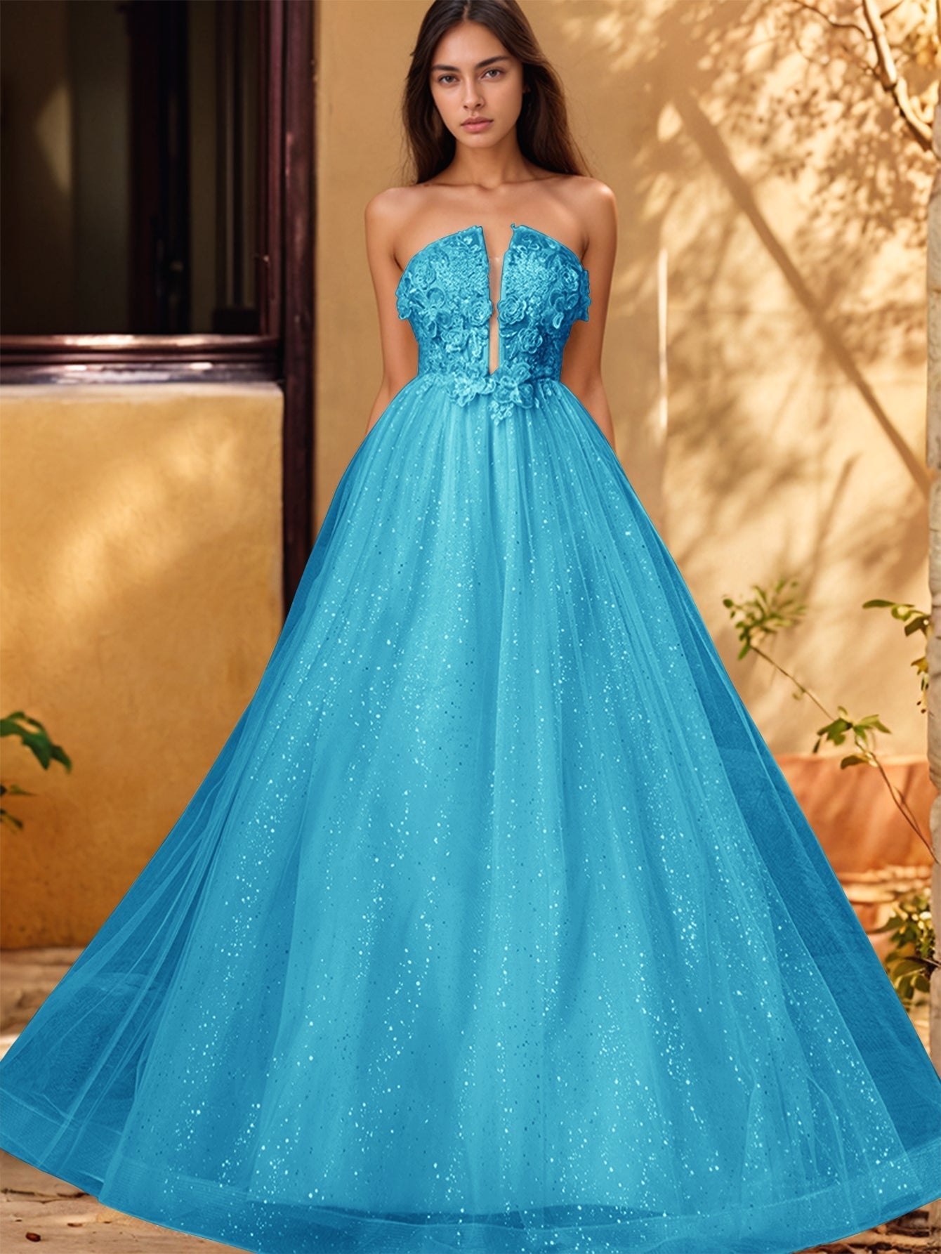 Vestido de gala de baile con escote pronunciado, encaje brillante y bordado de rosas en 3D