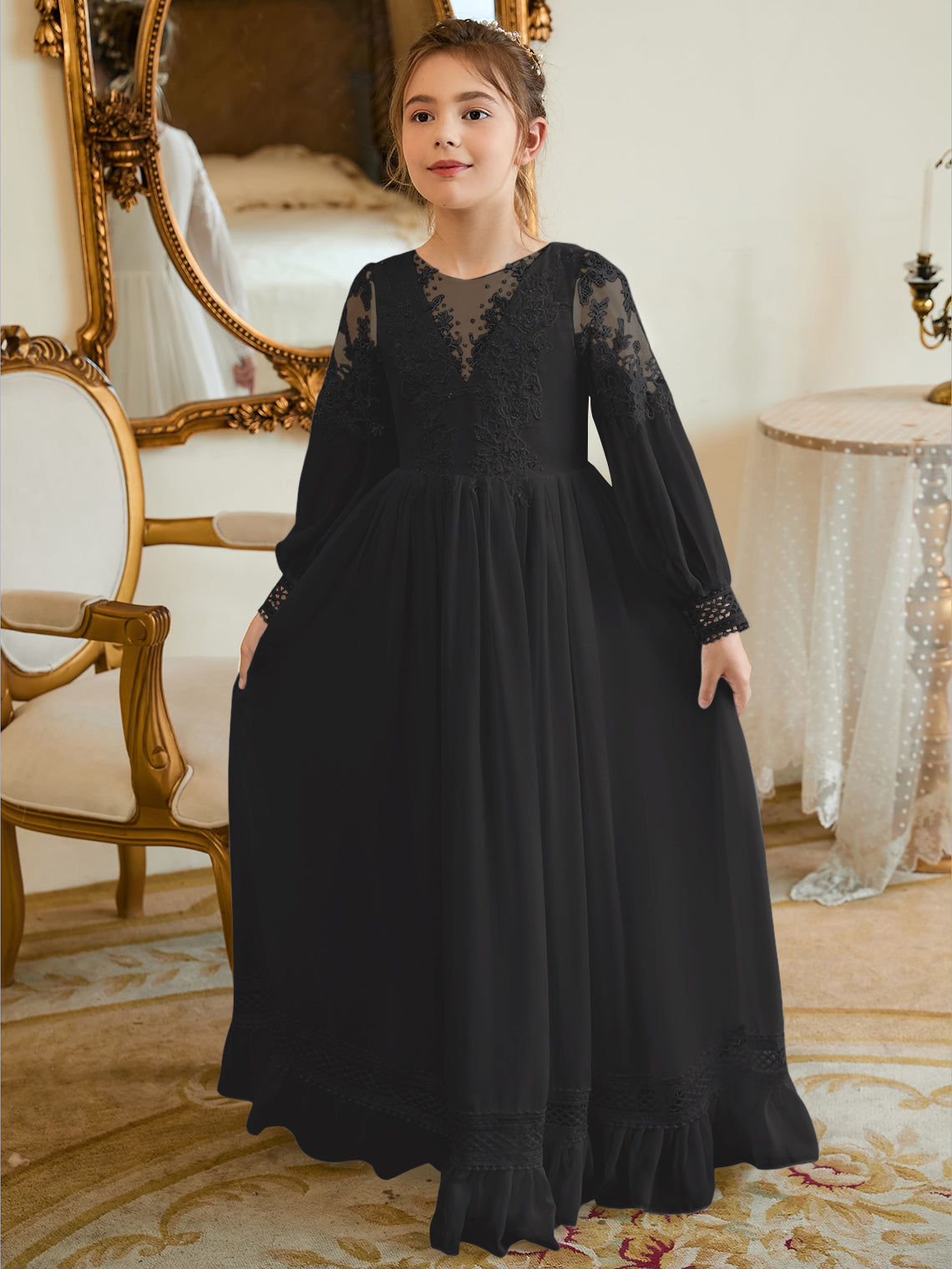 Vestido de Primera Comunión color marfil, corte en A, de gasa hasta el suelo