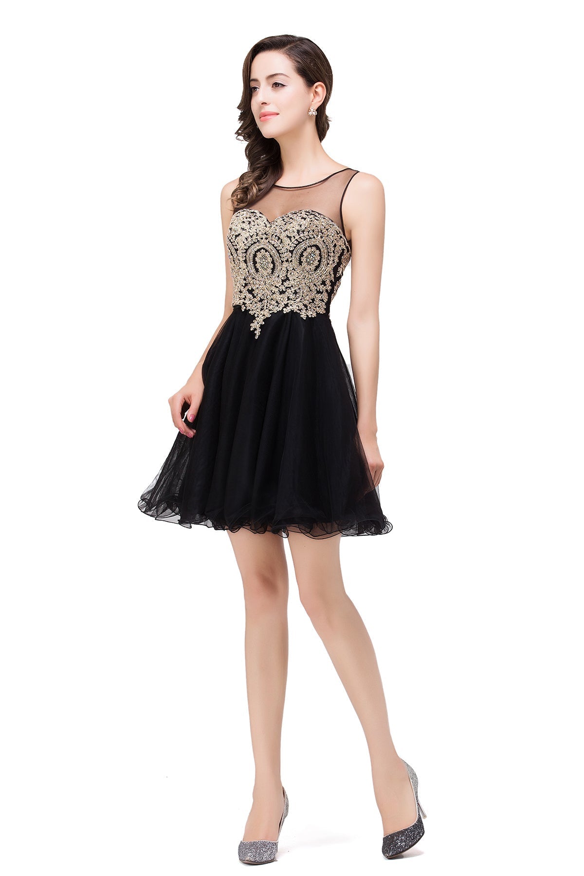 Vestidos de fiesta cortos sin mangas con apliques y corte en A