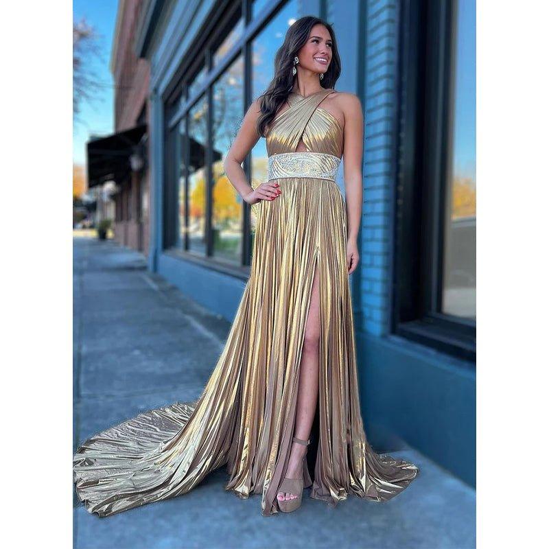 Vestido largo de noche color champán con tirantes cruzados, corte en A y cola de barrido.