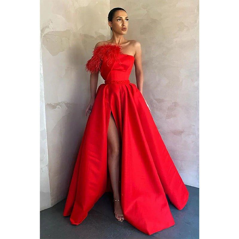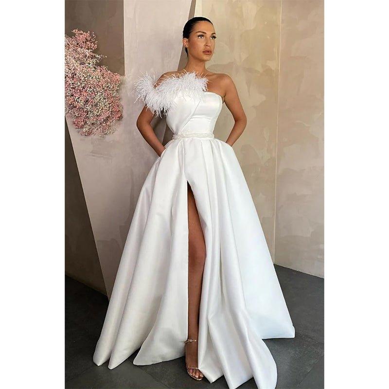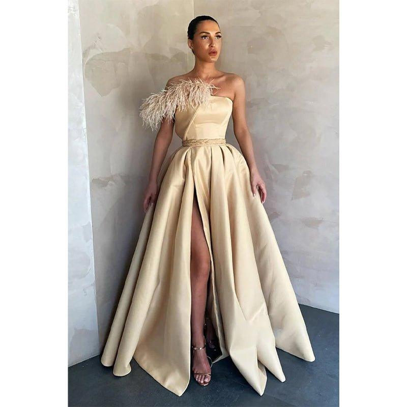Vestido de fiesta sin tirantes, corte en A, abertura alta y bolsillos