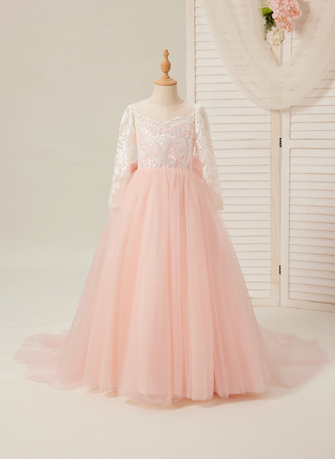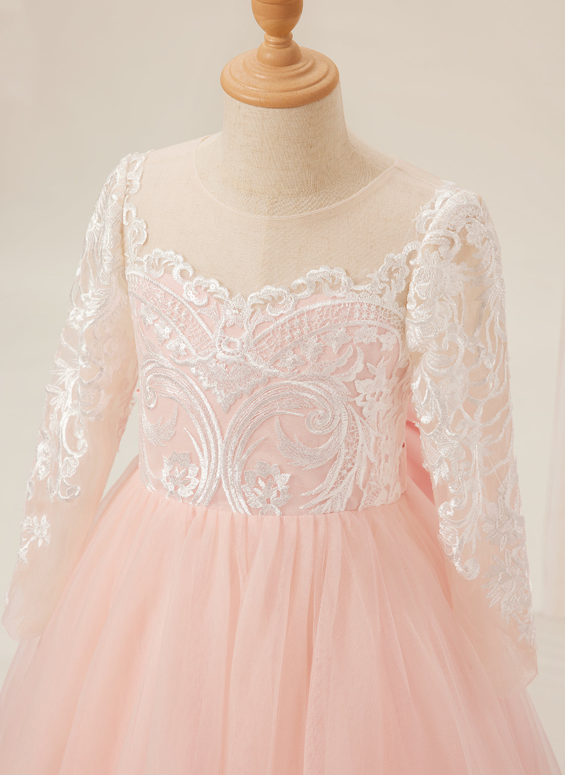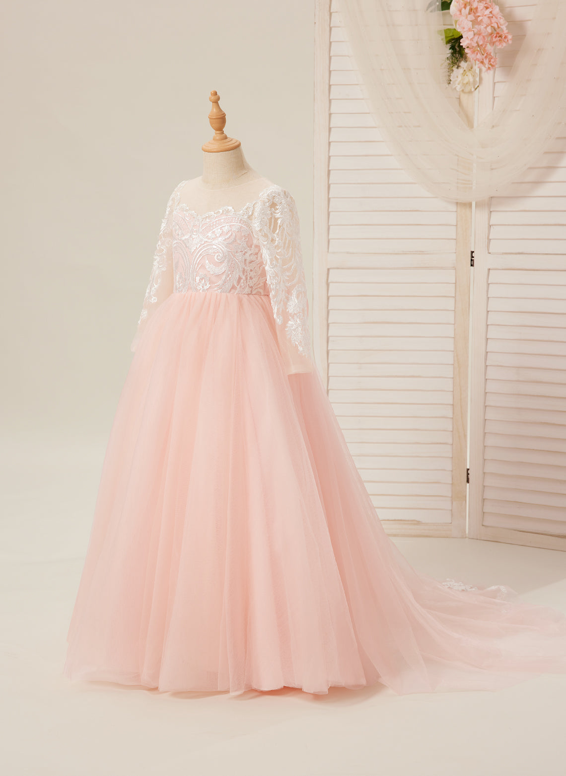 Vestidos de niña de las flores de corte A, manga larga, encaje y tul, color rosa (2003227575)
