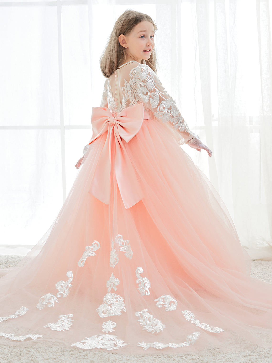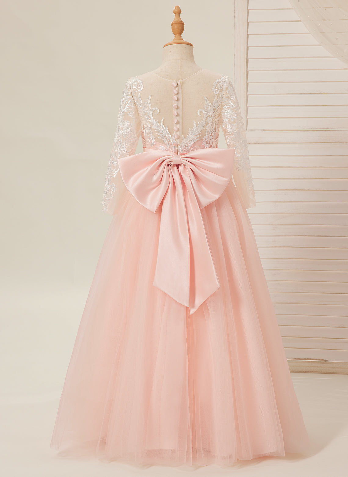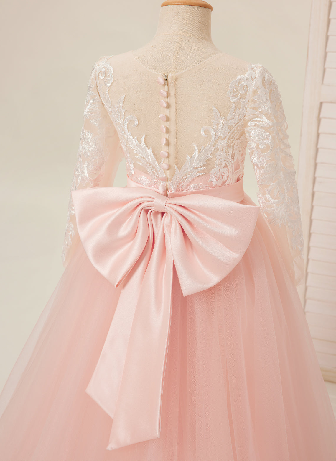 Vestidos de niña de las flores de corte A, manga larga, encaje y tul, color rosa (2003227575)