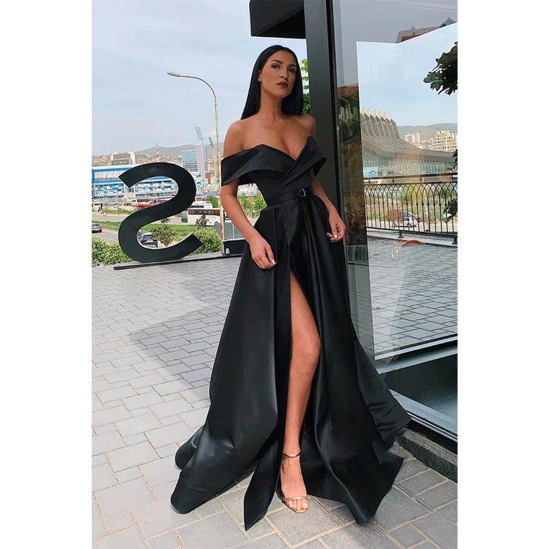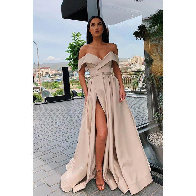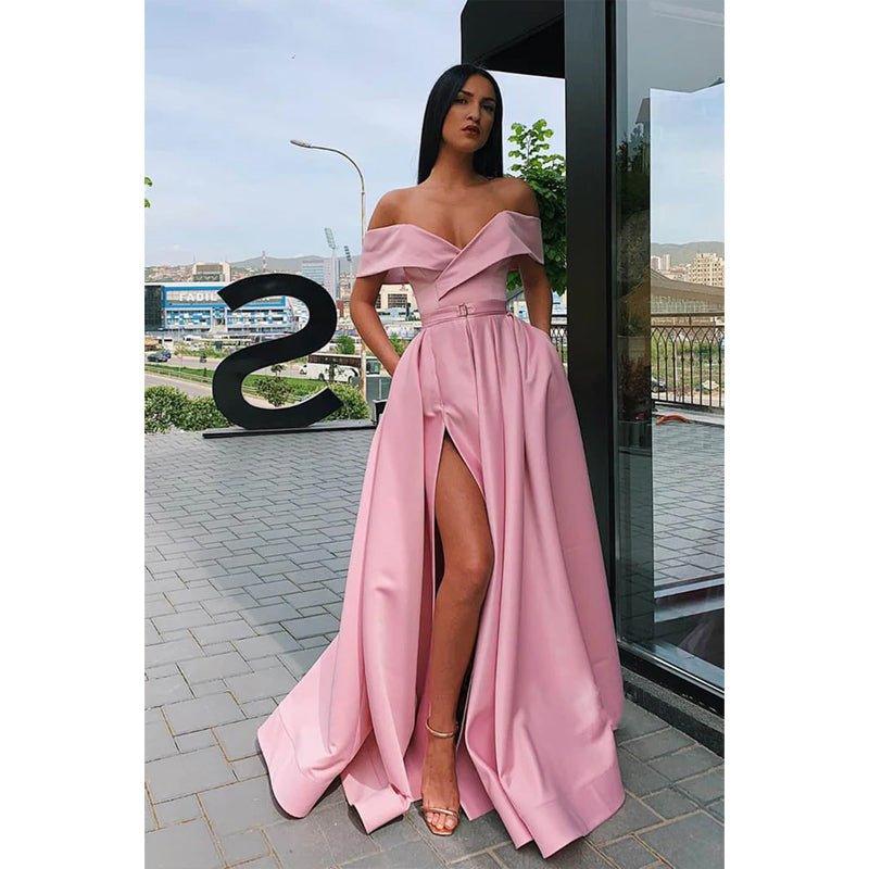 Vestido largo de fiesta de corte A, con hombros descubiertos, abertura alta y bolsillos.