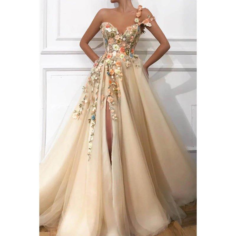 Vestido largo de fiesta de corte A con un solo hombro, apliques de tul y abertura