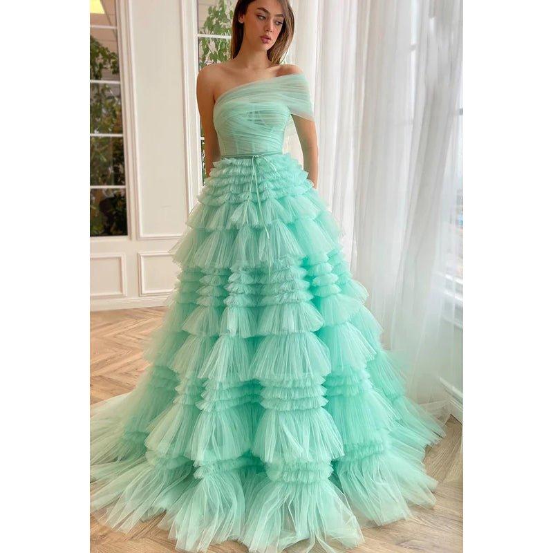 Vestido de graduación de corte A con un solo hombro, volantes de tul y cremallera