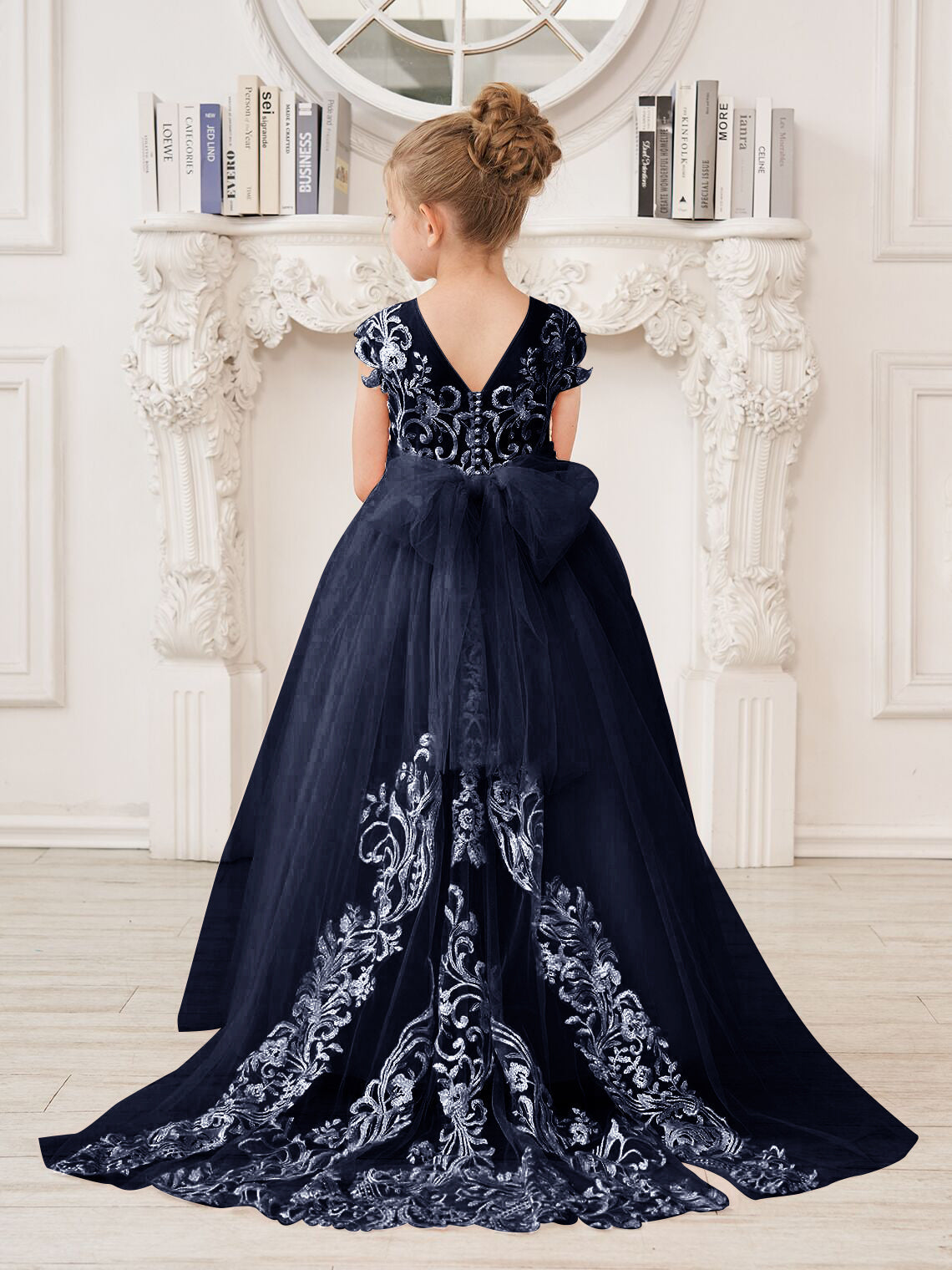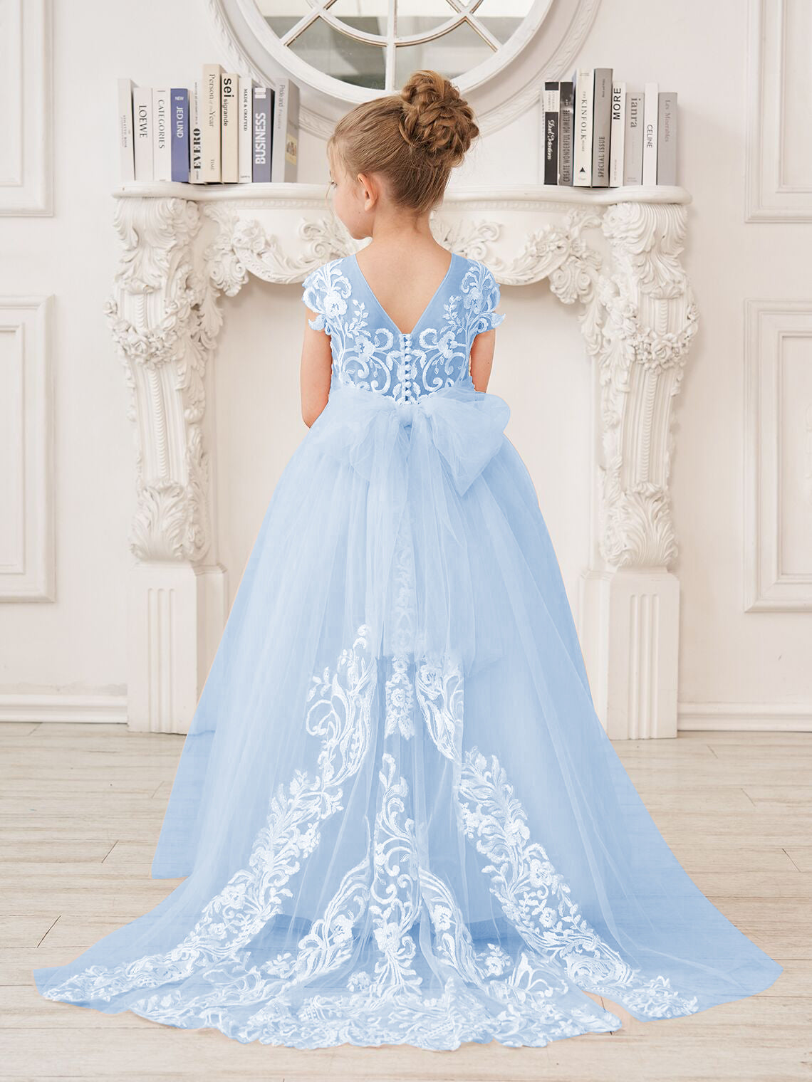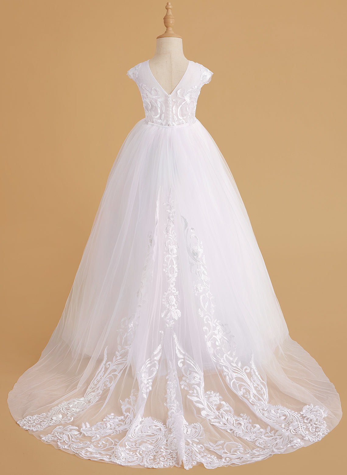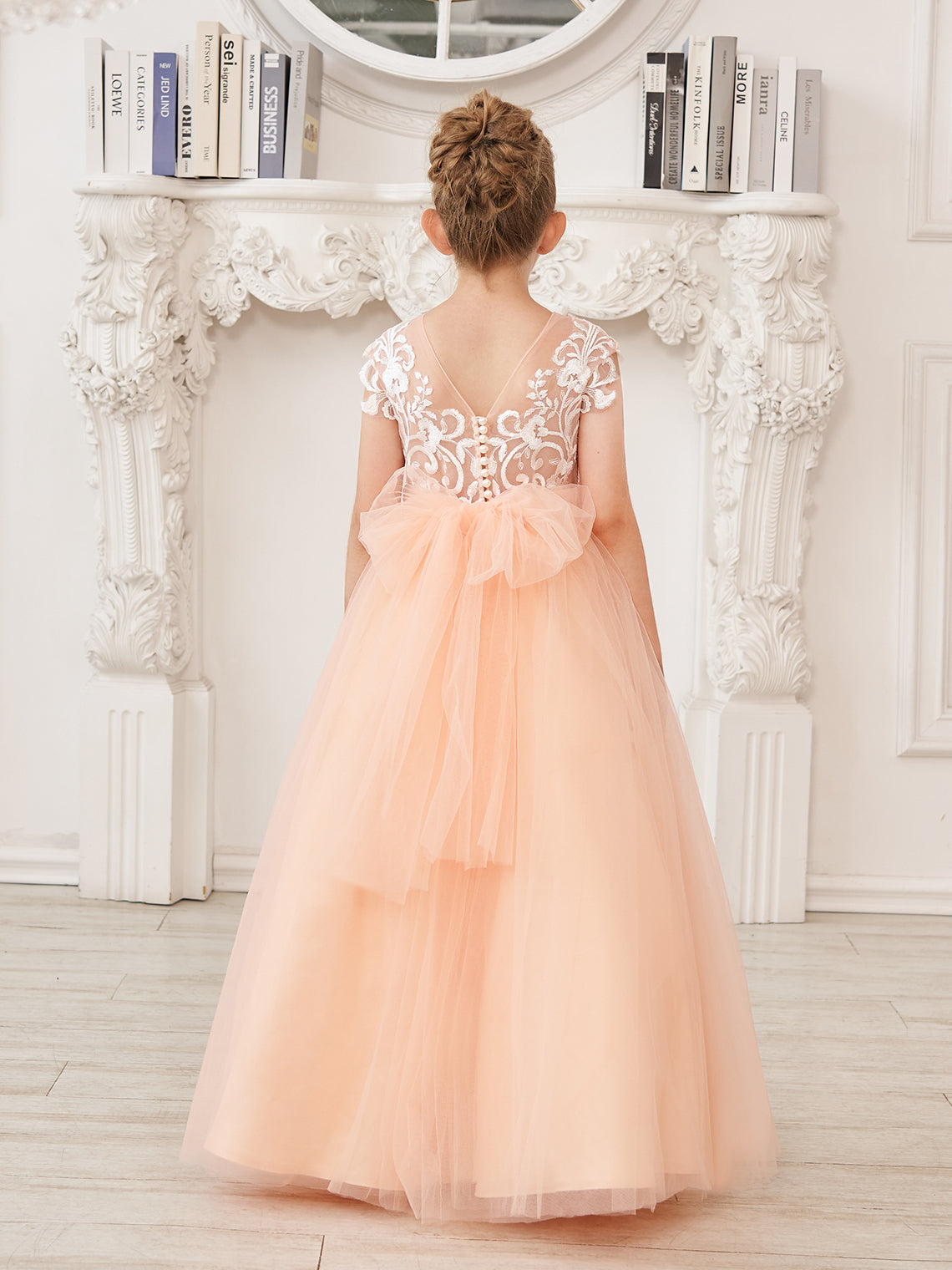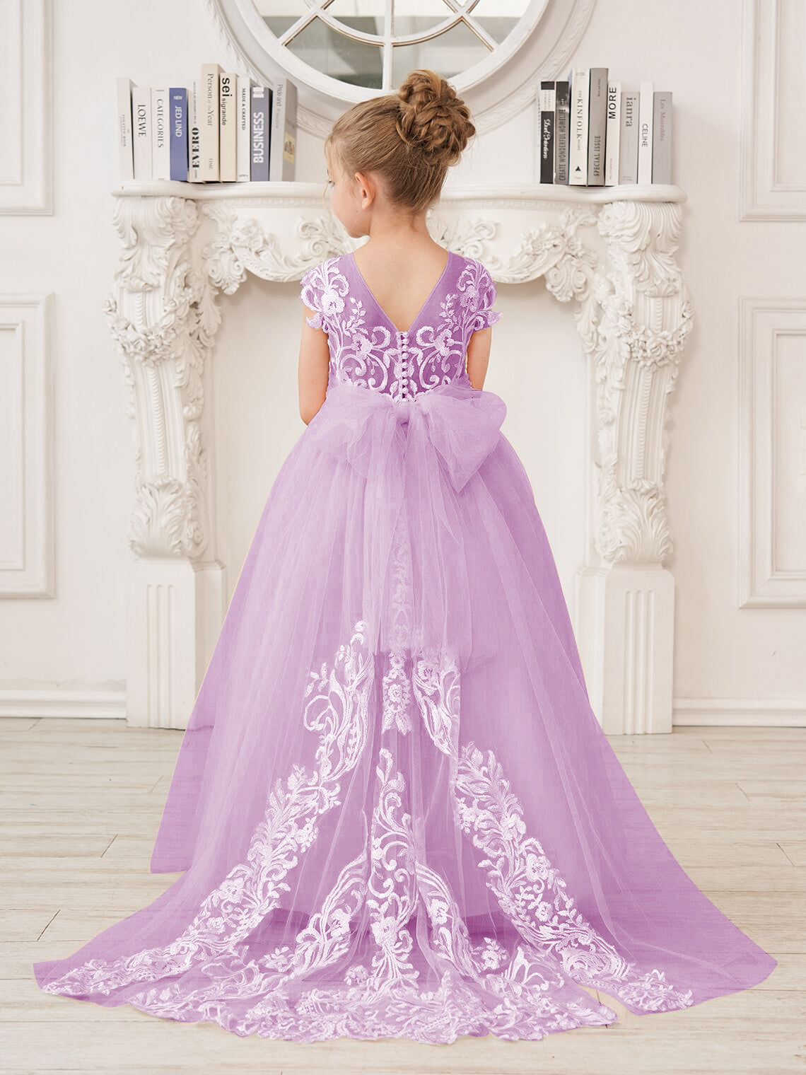 Vestido rosa de niña de las flores, corte en A, encaje, tul y cola corta