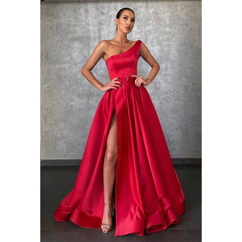 Vestido largo de fiesta rojo satinado de corte A, con un solo hombro, abertura alta y bolsillos.