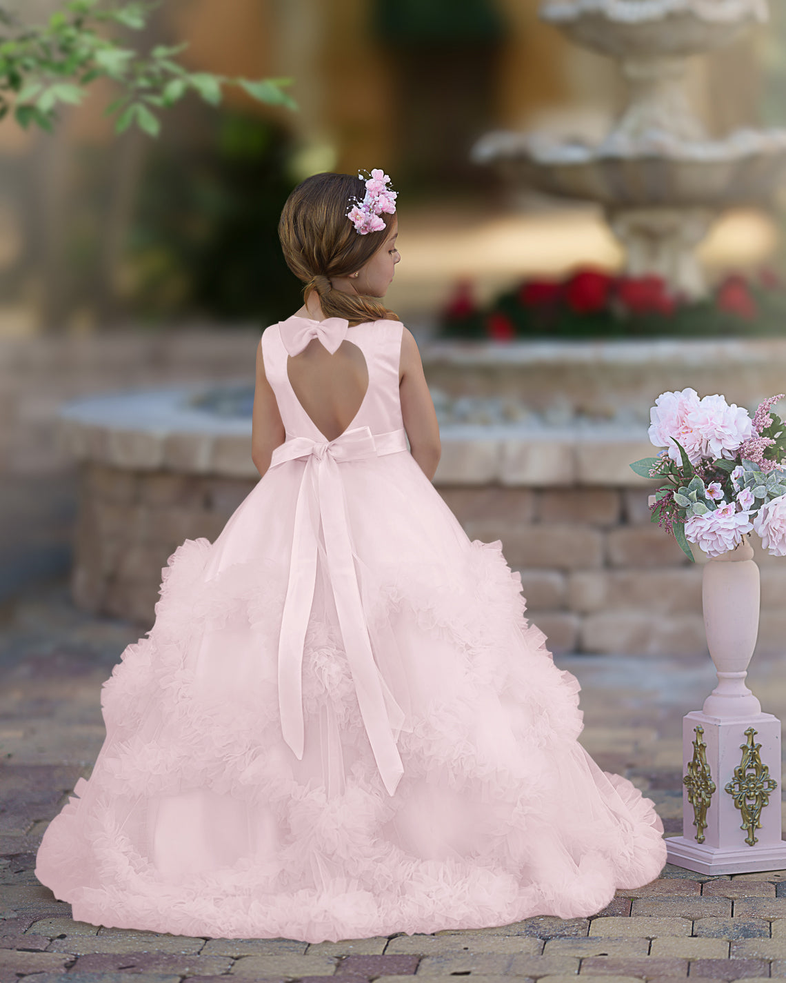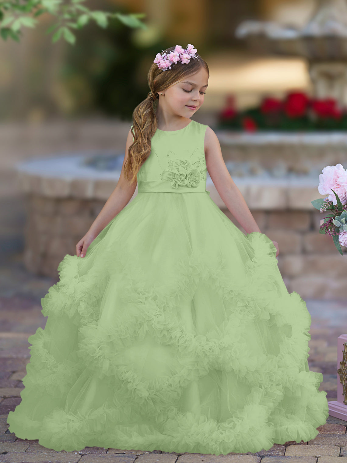 Vestido de niña de las flores de corte A, de satén y tul, hasta el suelo, con volantes en cascada.