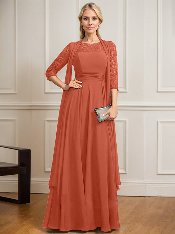 Vestido de novia de corte A, escote redondo ilusión, largo hasta el suelo, de gasa de encaje con pliegues.