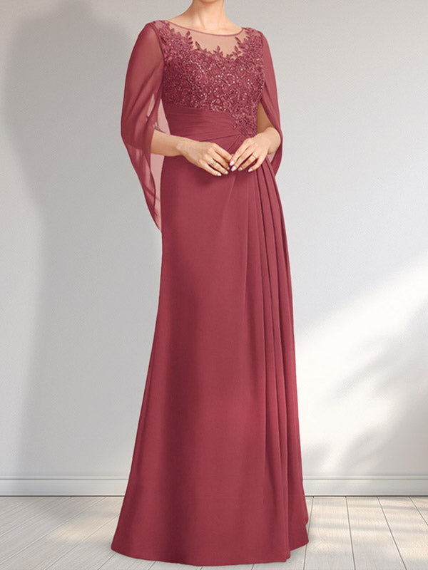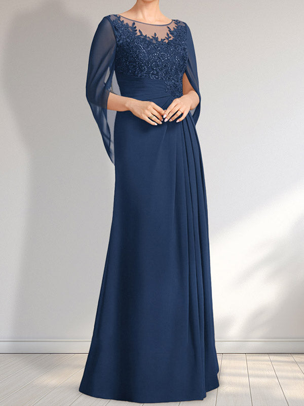 Vestido de novia de corte A, escote redondo ilusión, largo hasta el suelo, de gasa de encaje con lentejuelas plisadas.