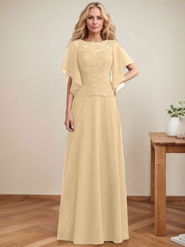 Vestido de novia de corte A, escote redondo, ilusión, largo hasta el suelo, de encaje y gasa con lentejuelas.