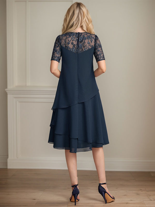 Vestido de novia de corte línea A con escote ilusión, largo hasta la rodilla, de encaje y gasa con lentejuelas.