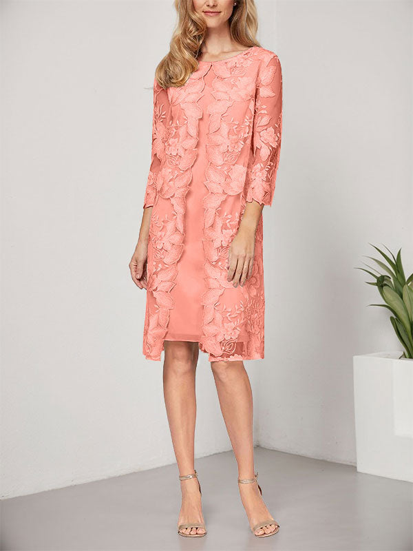 Vestido de corte A, escote redondo, largo hasta la rodilla, de gasa y encaje, para la madre de la novia, con chaqueta.