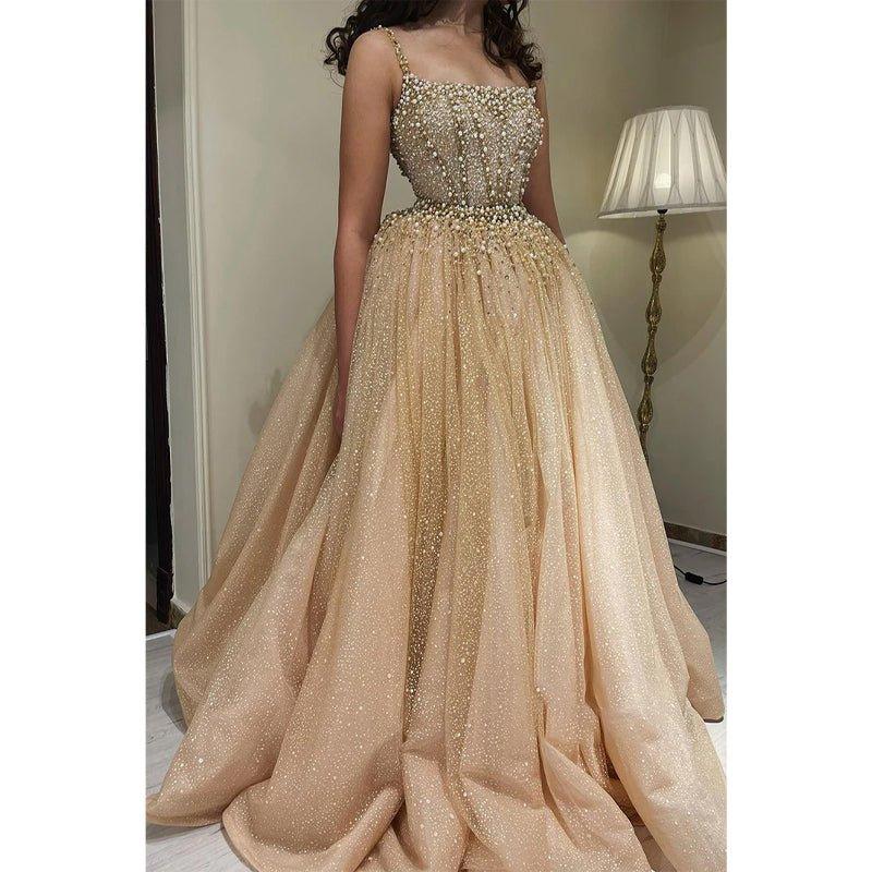 Vestido largo de noche formal de lujo con escote redondo y falda desmontable, corte en A y cuentas.