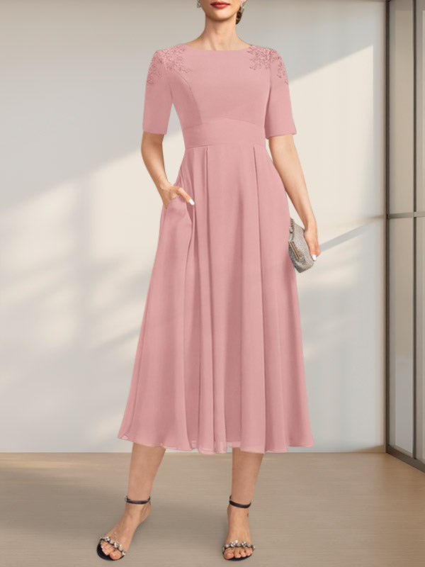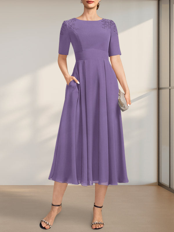 Vestido de corte A, escote redondo, largo té, de gasa, para la madre de la novia, con apliques de encaje y lentejuelas.