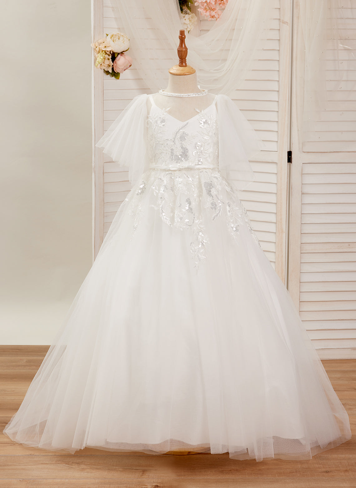Vestido de niña de las flores para la Primera Comunión, corte en A, de tul con cola de barrido, color marfil.